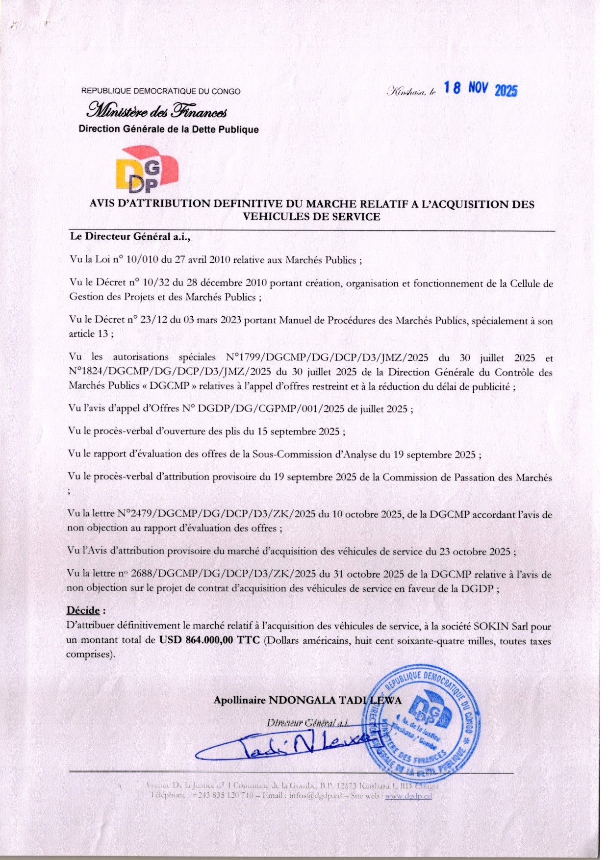 Attribution définitive accordée à la société “PRODIMPEX S.A” relatif au marché d’acquisition d’un matériel roulant pour le Fonds Social de la RDC (FSRDC).