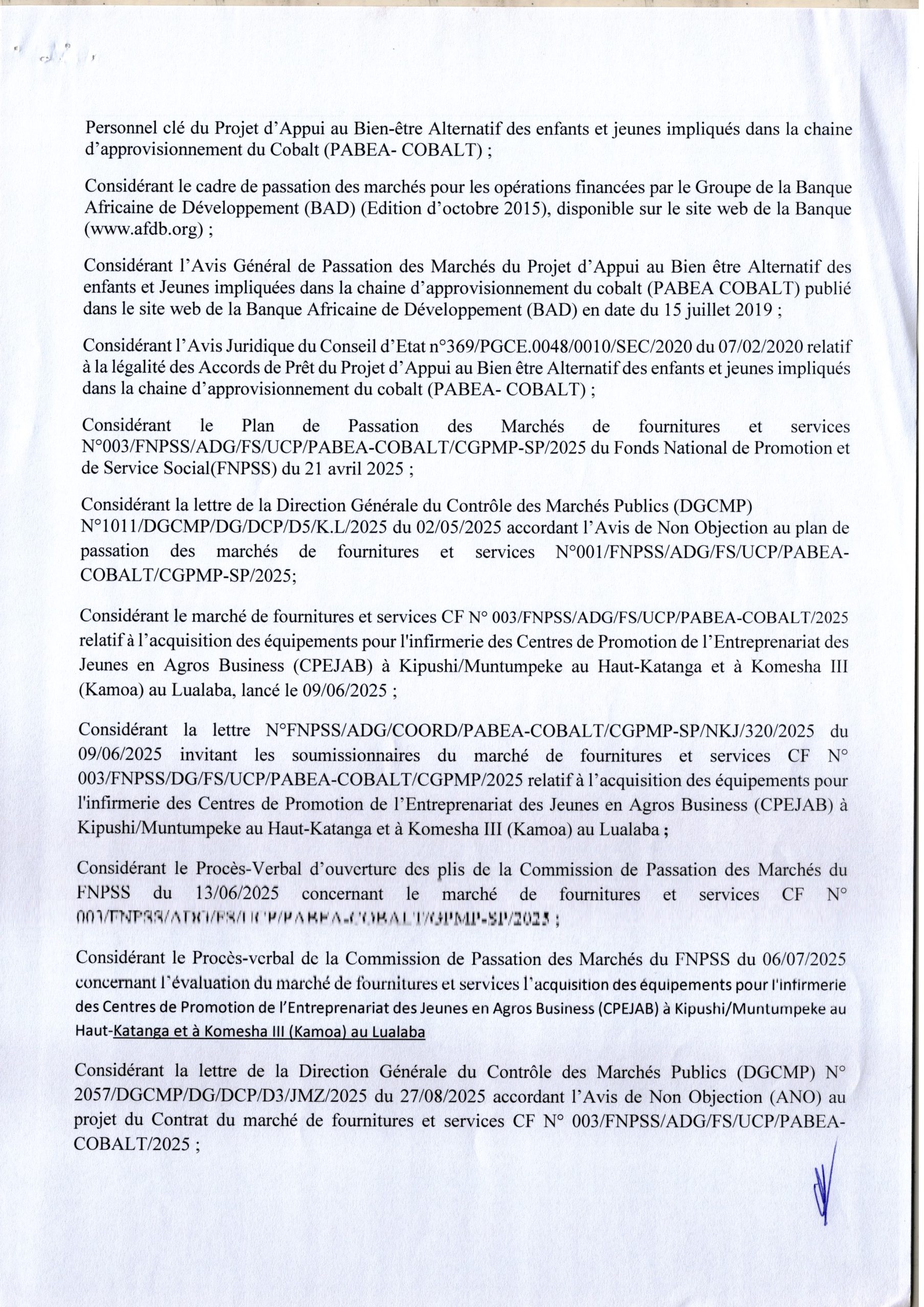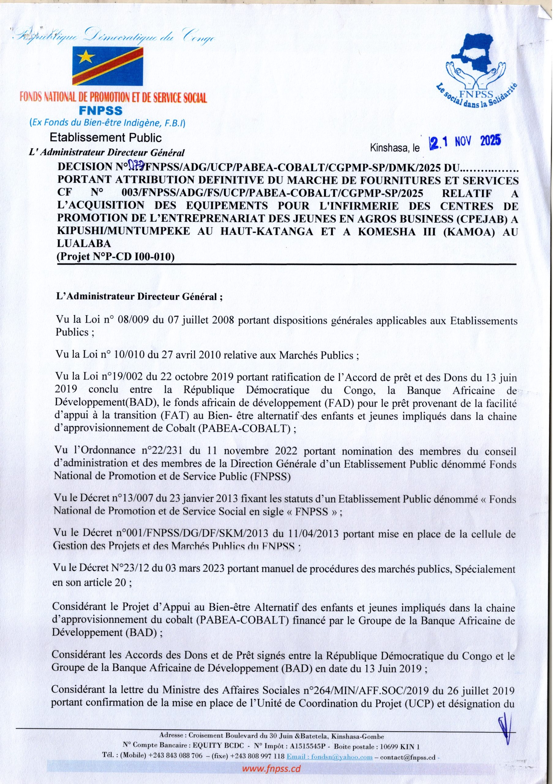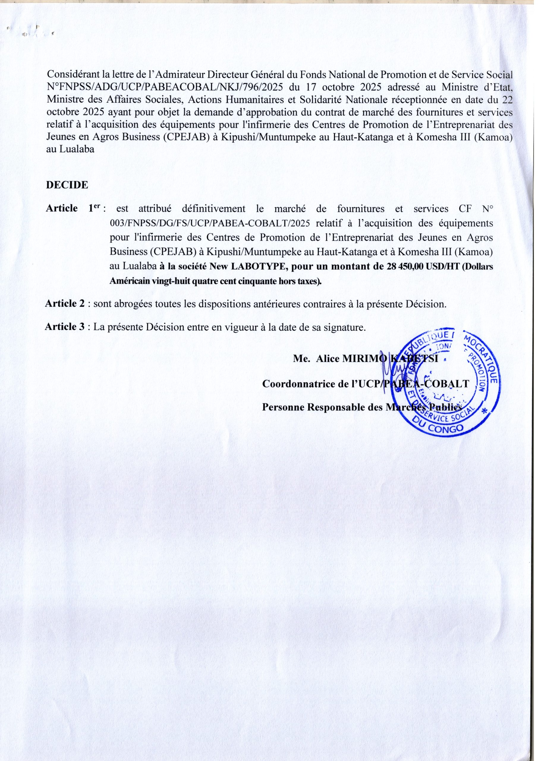 Attribution définitive accordée à la société “NEW LABOTYPE” relatif au marché d’acquisition des équipements pour l’infirmérie des centres de promotion de l’entreprenariat des jeunes en Agros Business (CPEJAB) à Kipushi/Muntumpeke au Haut-Katanga et à Komesha III (Kamoa) au Lualaba.
