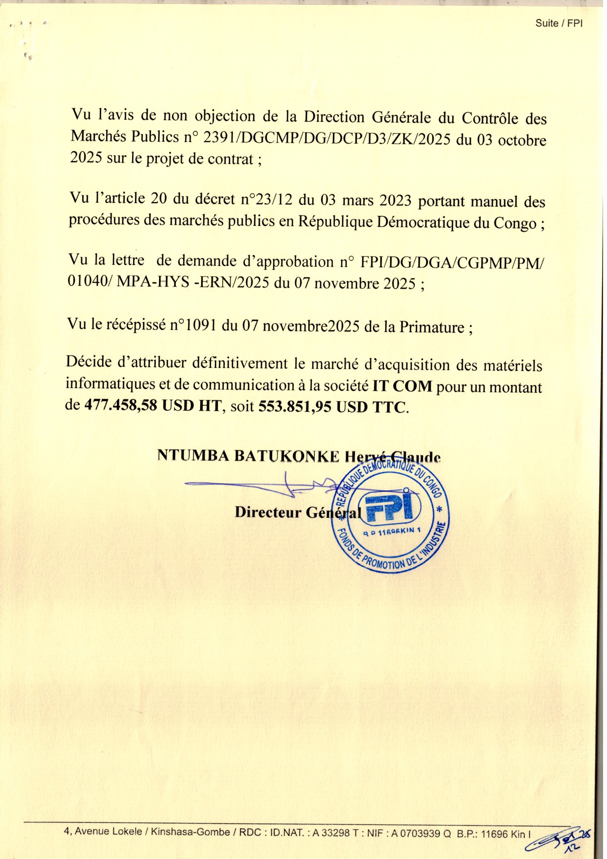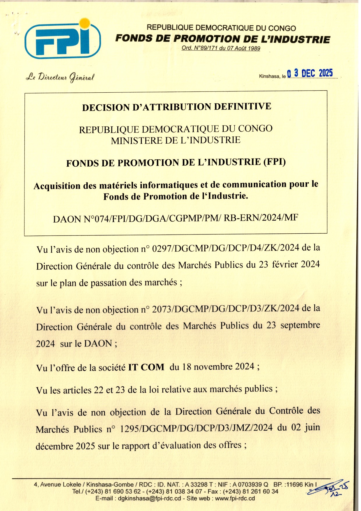 Attribution Définitive du marché relatif à l’Acquisition des matériels informatiques et de communication pour le Fonds de Promotion de de l’Industrie à la société IT COM