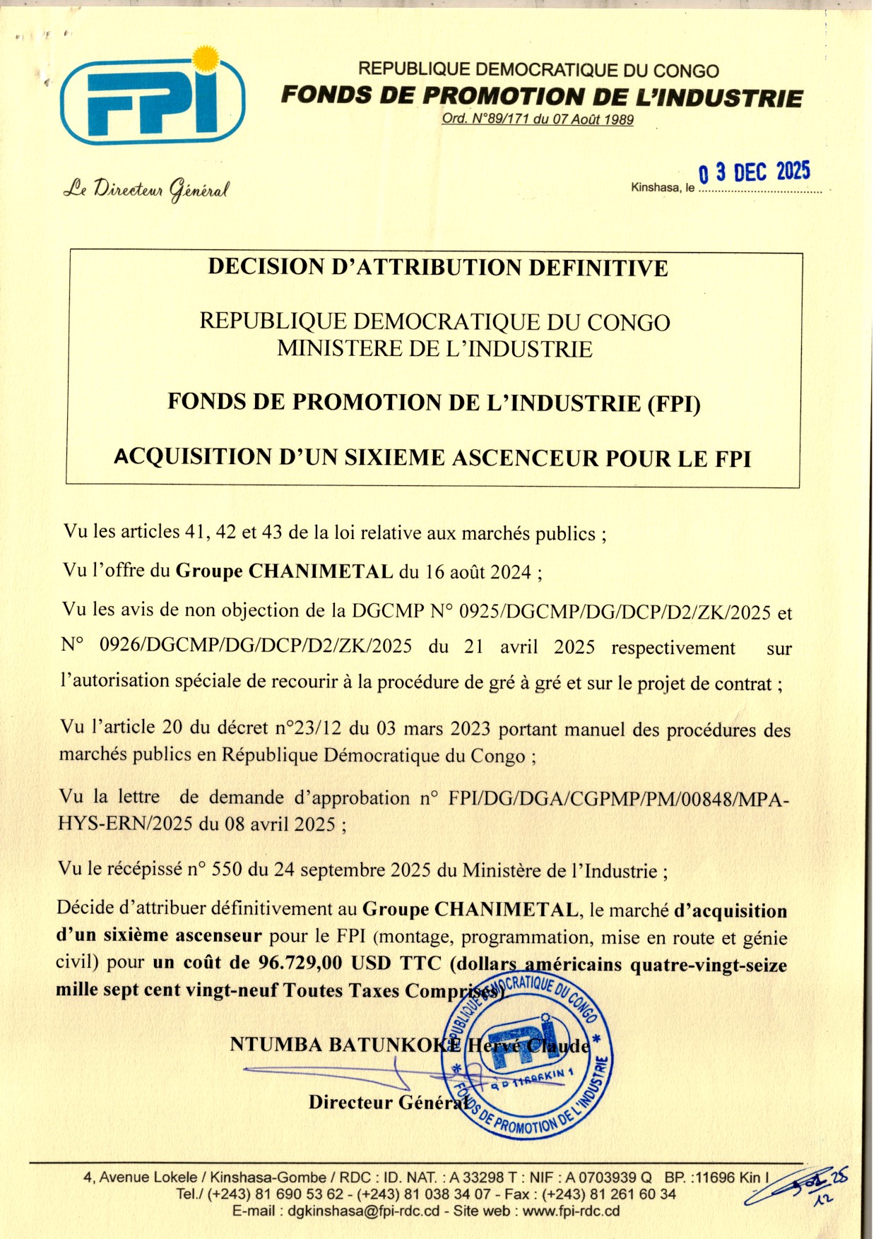 Attribution Définitive du marché relatif à l’Acquisition d’un Sixième Ascenseur pour le FPI au Groupe CHANIMETAL