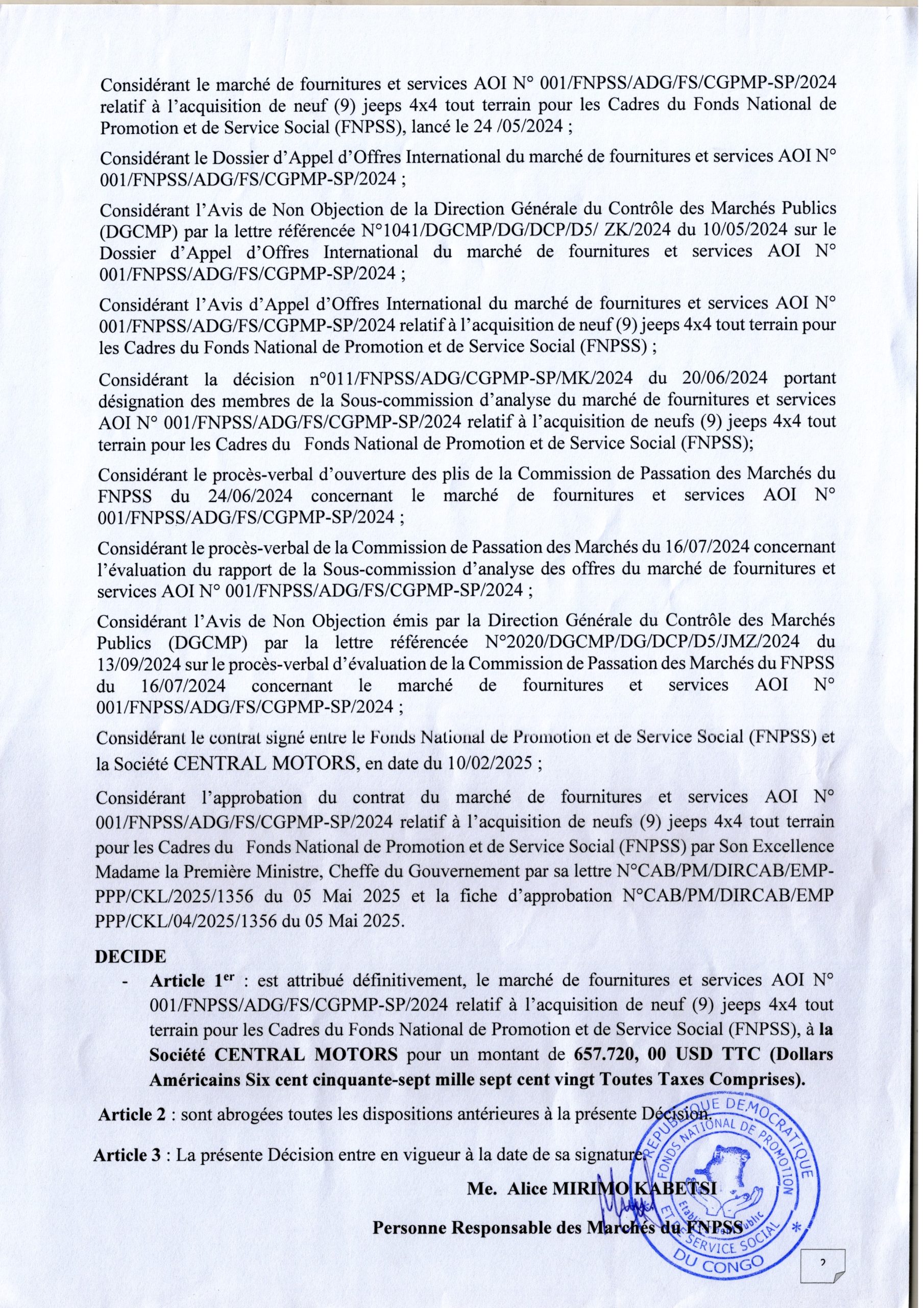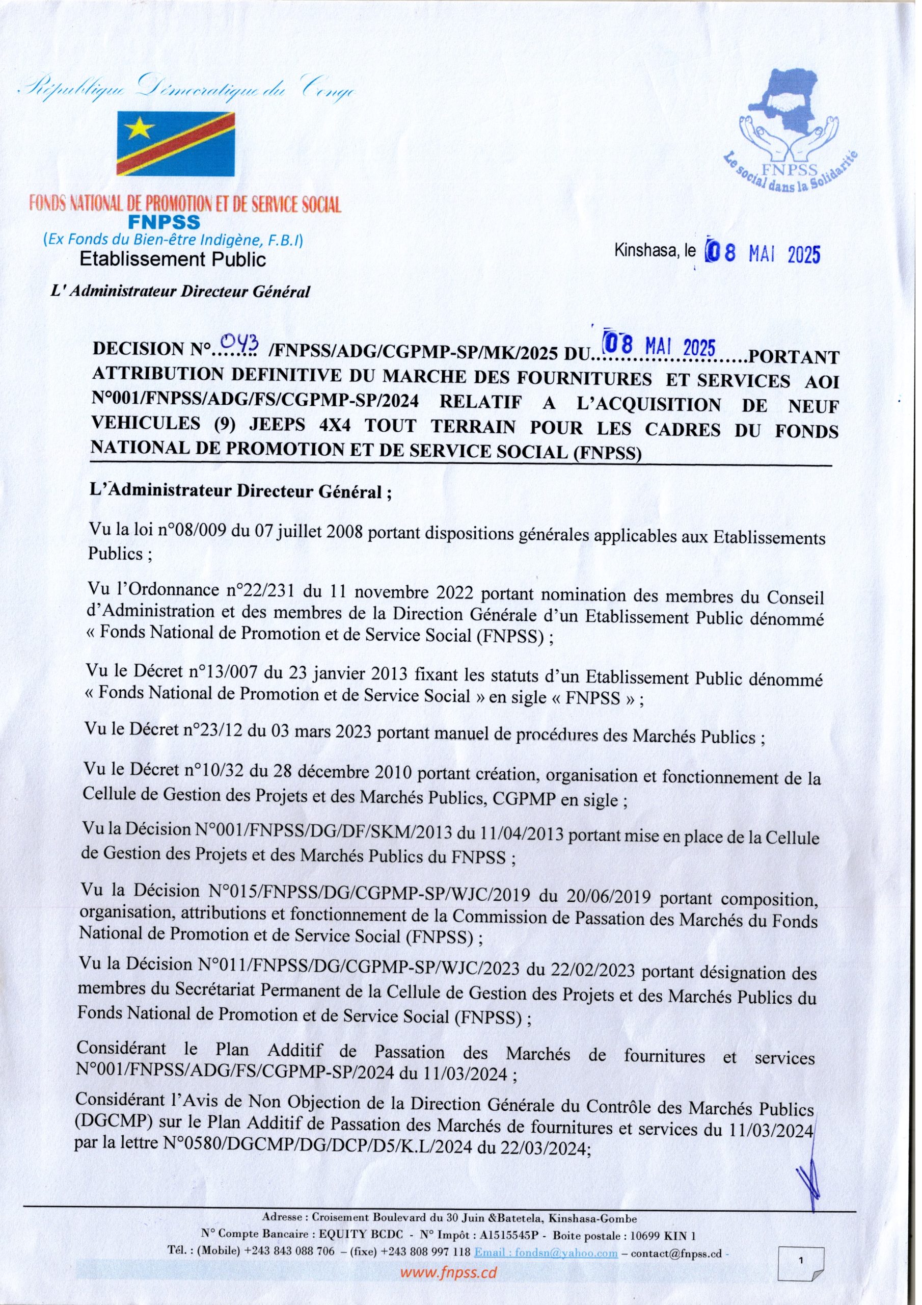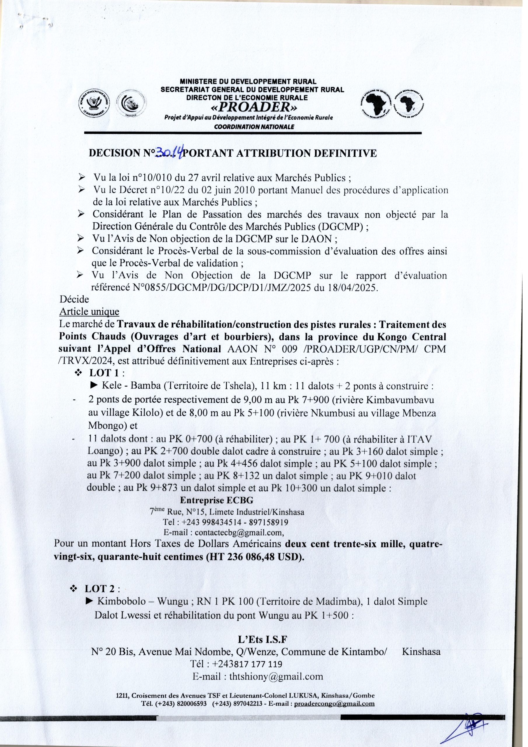 Décision d’attribution définitive accordée à l’entreprise Mining Engineering Services (MES) SARL relative au marché des travaux de construction de la ligne de transport en support monopodes simples ternes 120 KV NZILO-RO1 et NZILO-RO2 dans la province du Lualaba en RDC.