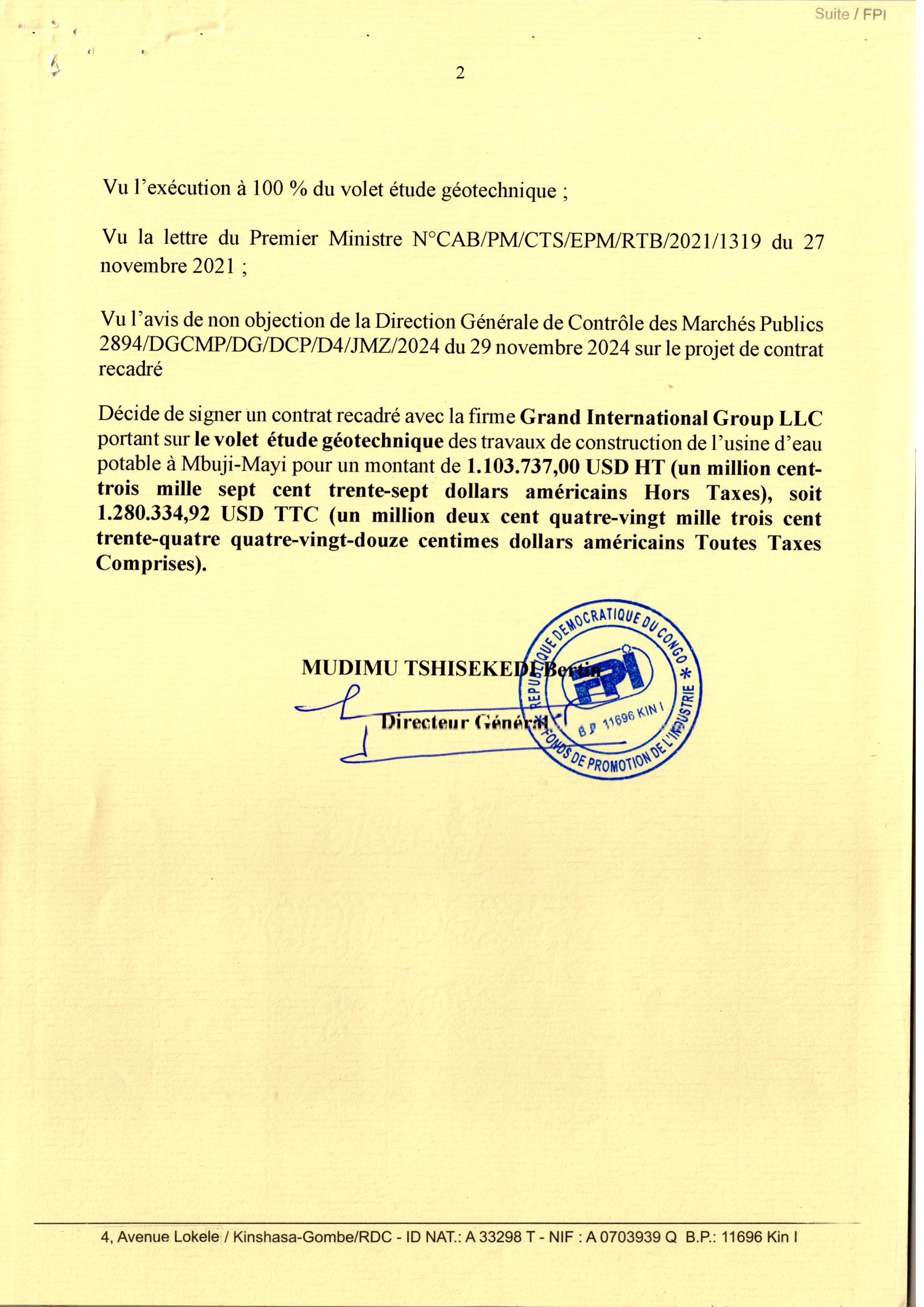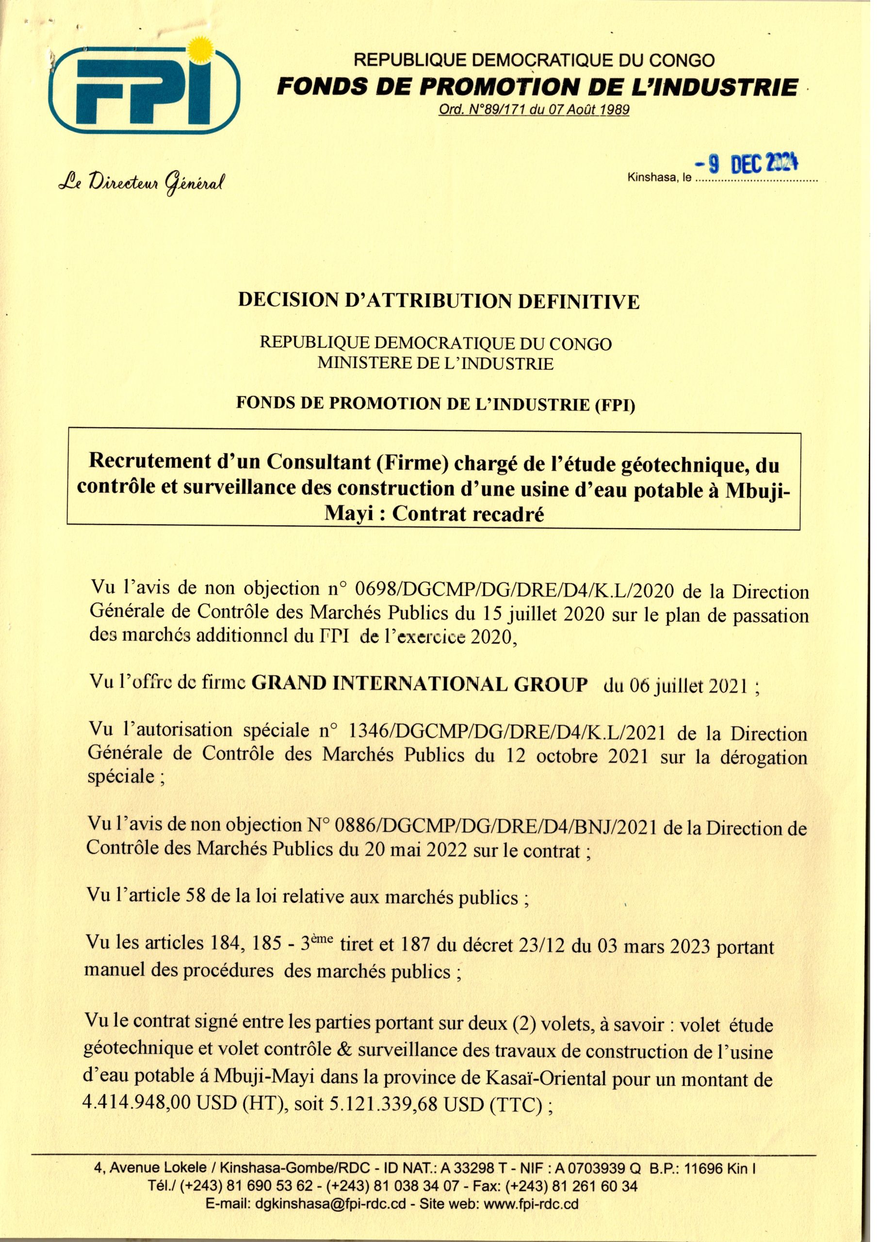 Attribution définitive accordée à la Firme Grand International Group LLC relative au recrutement d’un consultant (Firme) chargé de l’étude géotechnique, du contrôle et surveillance des construction d’une usine d’eau potable à Mbuji-Mayi.