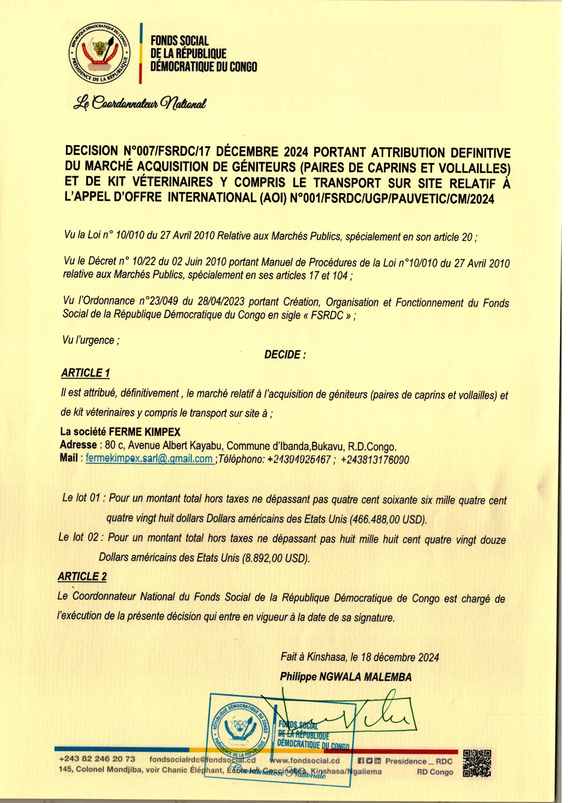 Attribution définitive accordée à la société FERME KIMPEX relative à l’acquisition de Géniteurs (Paires de caprins et volailles) et de Kit vétérinaires y compris le transport.