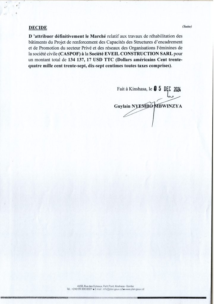 Attribution définitive du Marché des travaux de réhabilitation des bâtiments du Projet de renforcement des capacités des Structures d’encadrement et de Promotion du secteur Privé et des réseaux des Organisations Féminines de la société civile (CASPOF) à la Société EVEIL CONSTRUCTION SARL.