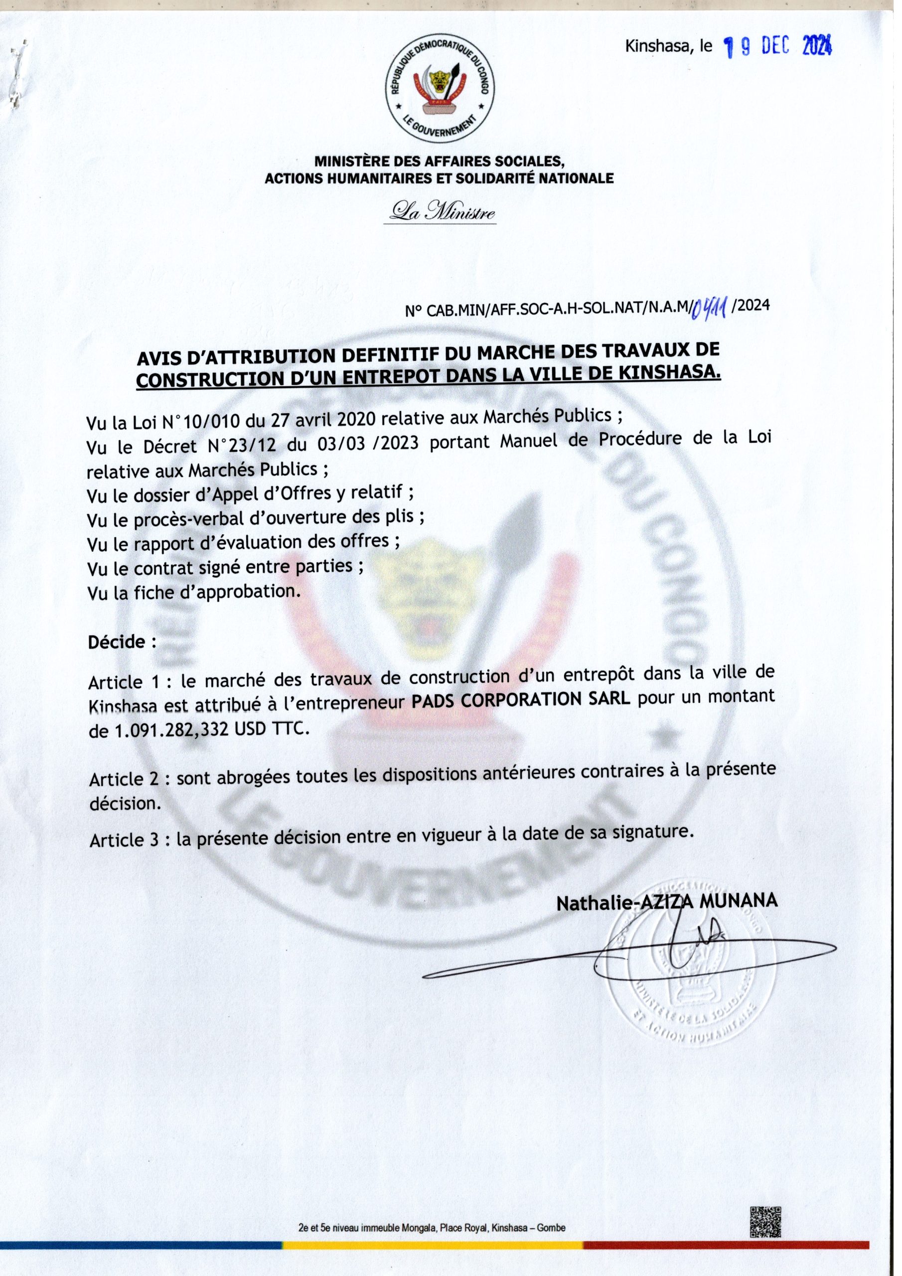 Attribution définitive accordée à la société “PADS CORPORATION SARL” le marché relatif à la construction d’un entrepôt dans la ville de Kinshasa