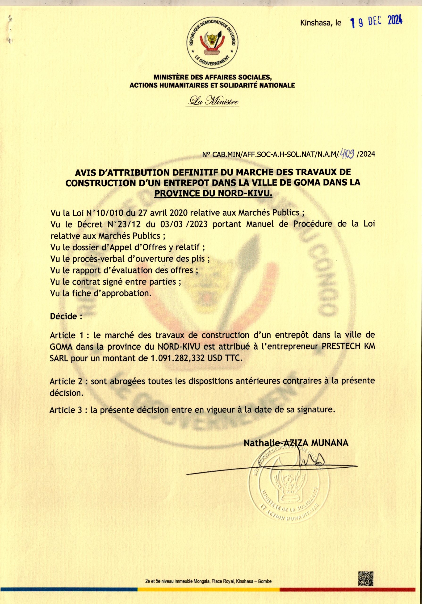 Attribution définitive accordée à la société “PRESTECH KM SARL” le marché relatif à la construction d’un entrepôt dans la ville de Goma.