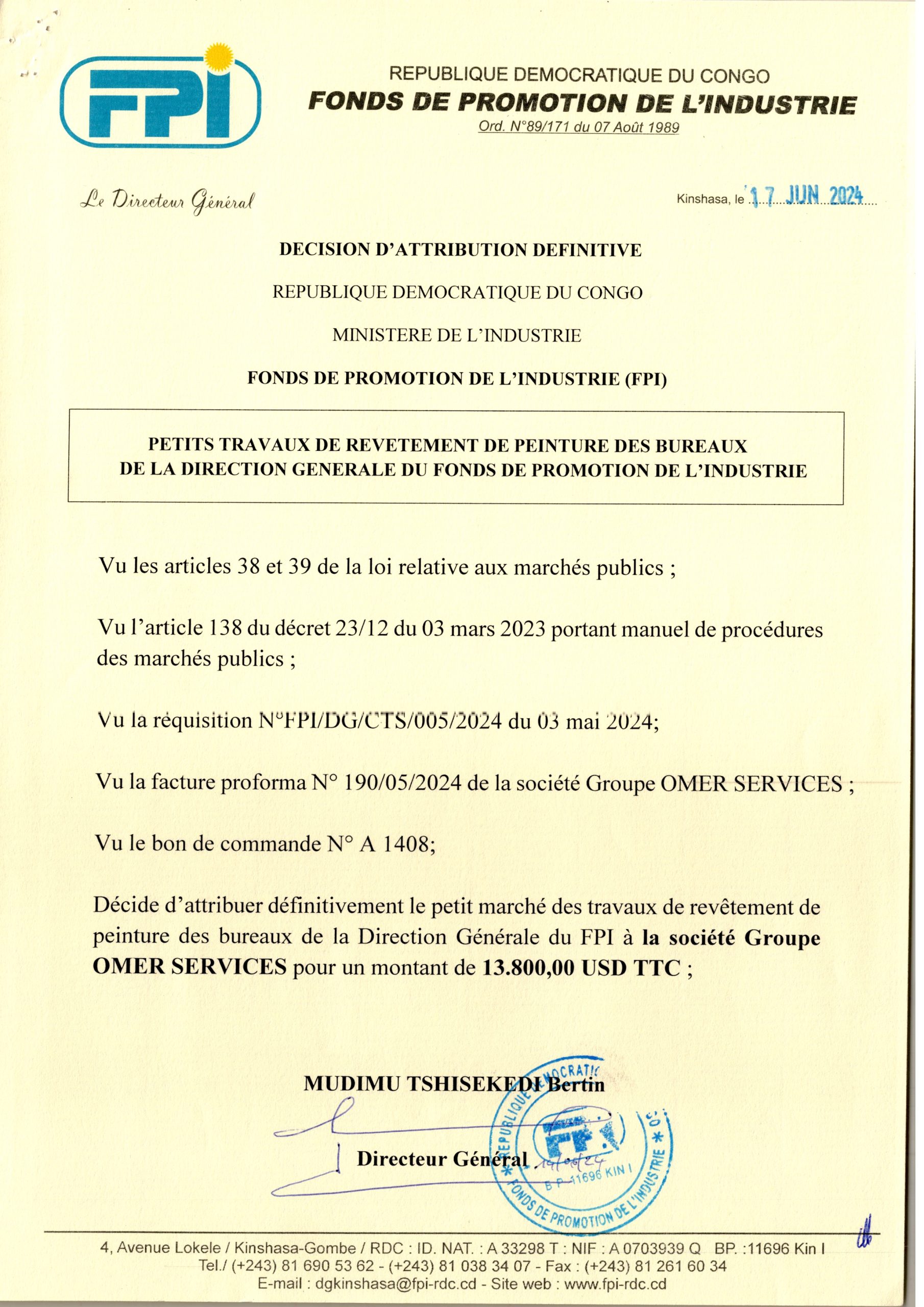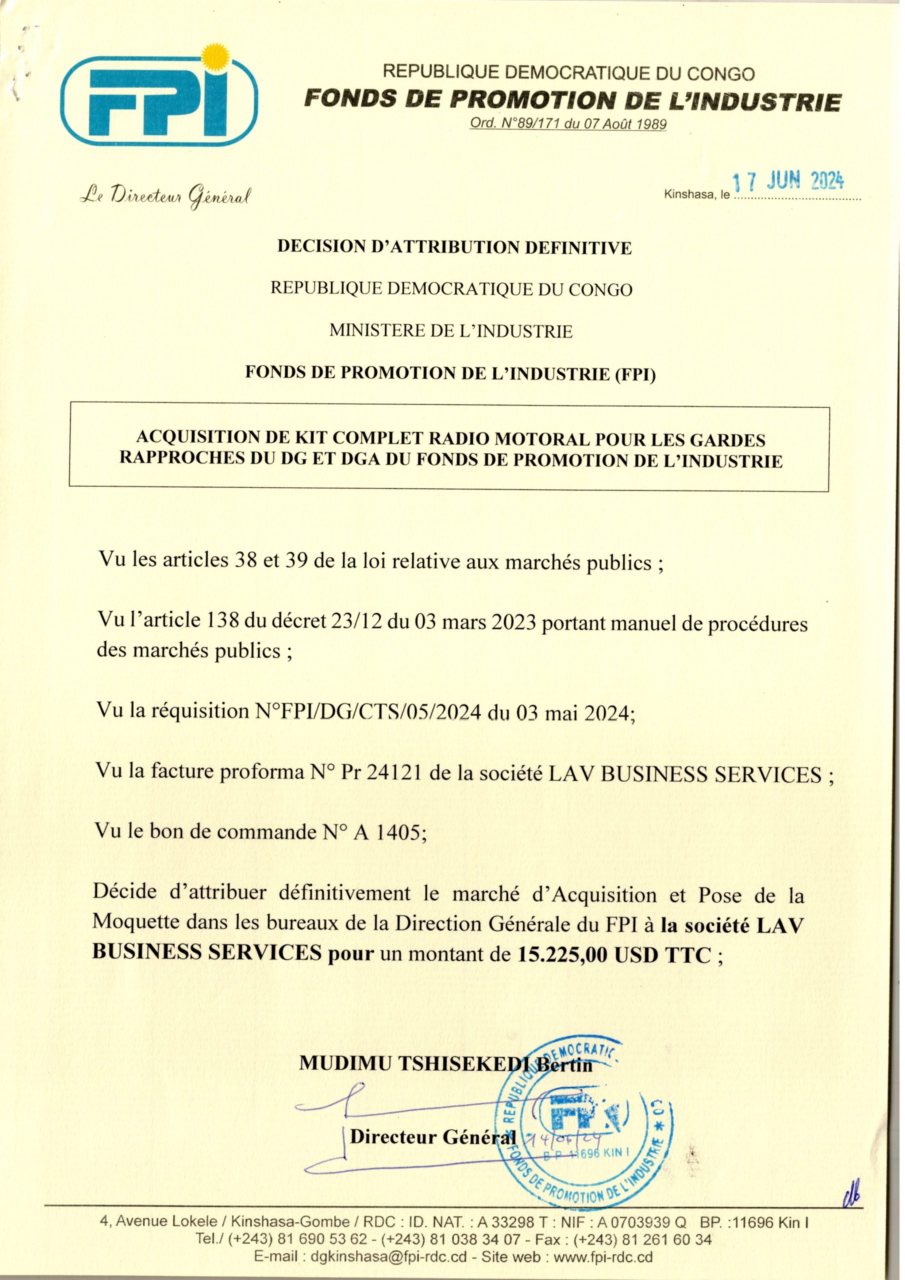 Attribution Définitive du marché relatif à l’Acquisition de Kit Complet Radio Motoral pour les gardes Rapproches du DG et DGA du Fonds de Promotion de l’Industrie à la société LAV BUSINESS SERVICES