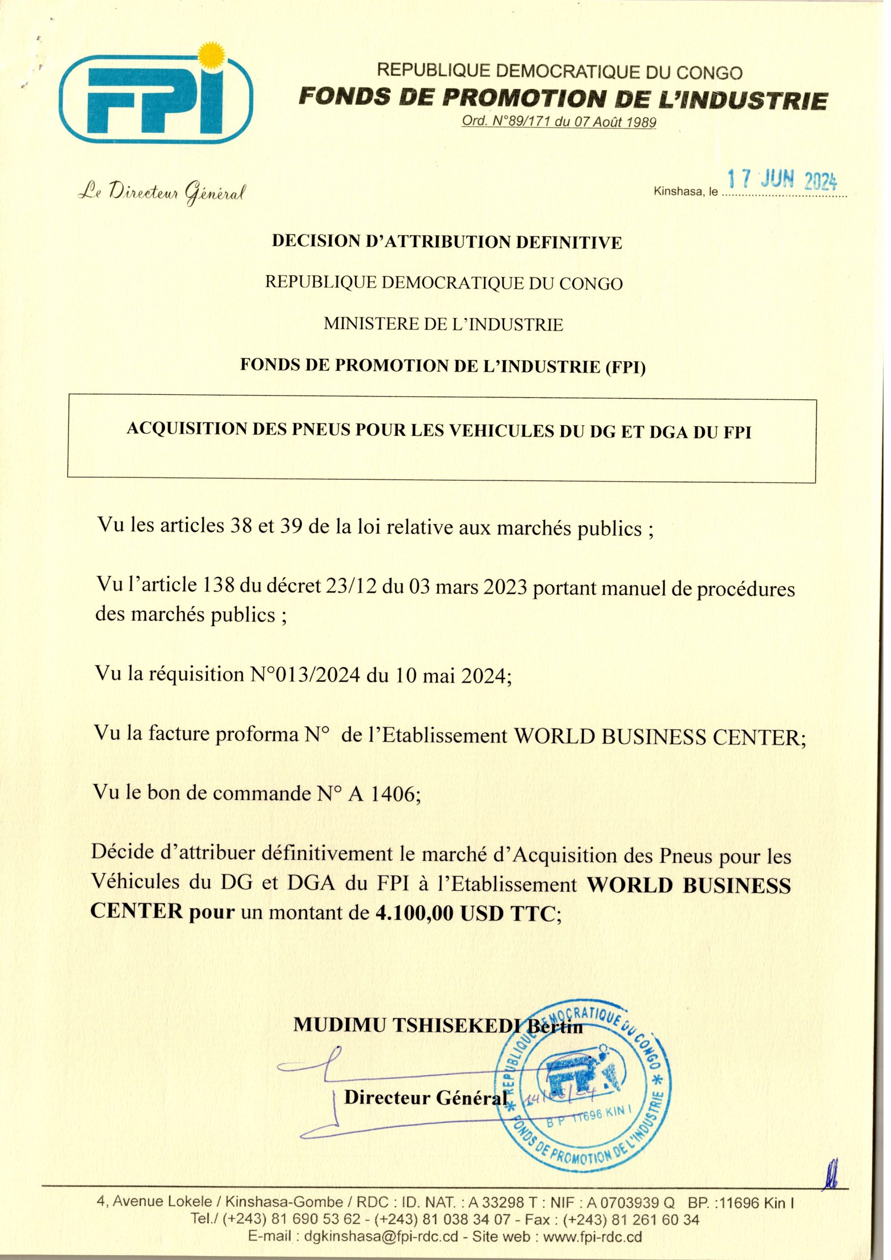Attribution Définitive du marché relatif à l’Acquisition des pneus pour les véhicules du DG et DGA du FPI à l’Etablissement WORLD BUSINESS CENTER