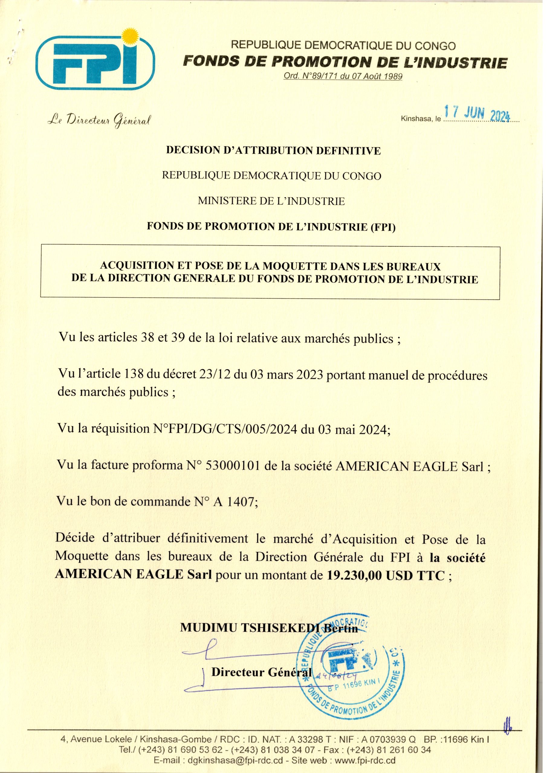 Attribution Définitive du marché relatif à l’Acquisition et de pose de la moquette dans les bureaux de la direction Générale du Fonds de Promotion de l’Industrie à la société AMERICAN EAGLE Sarl