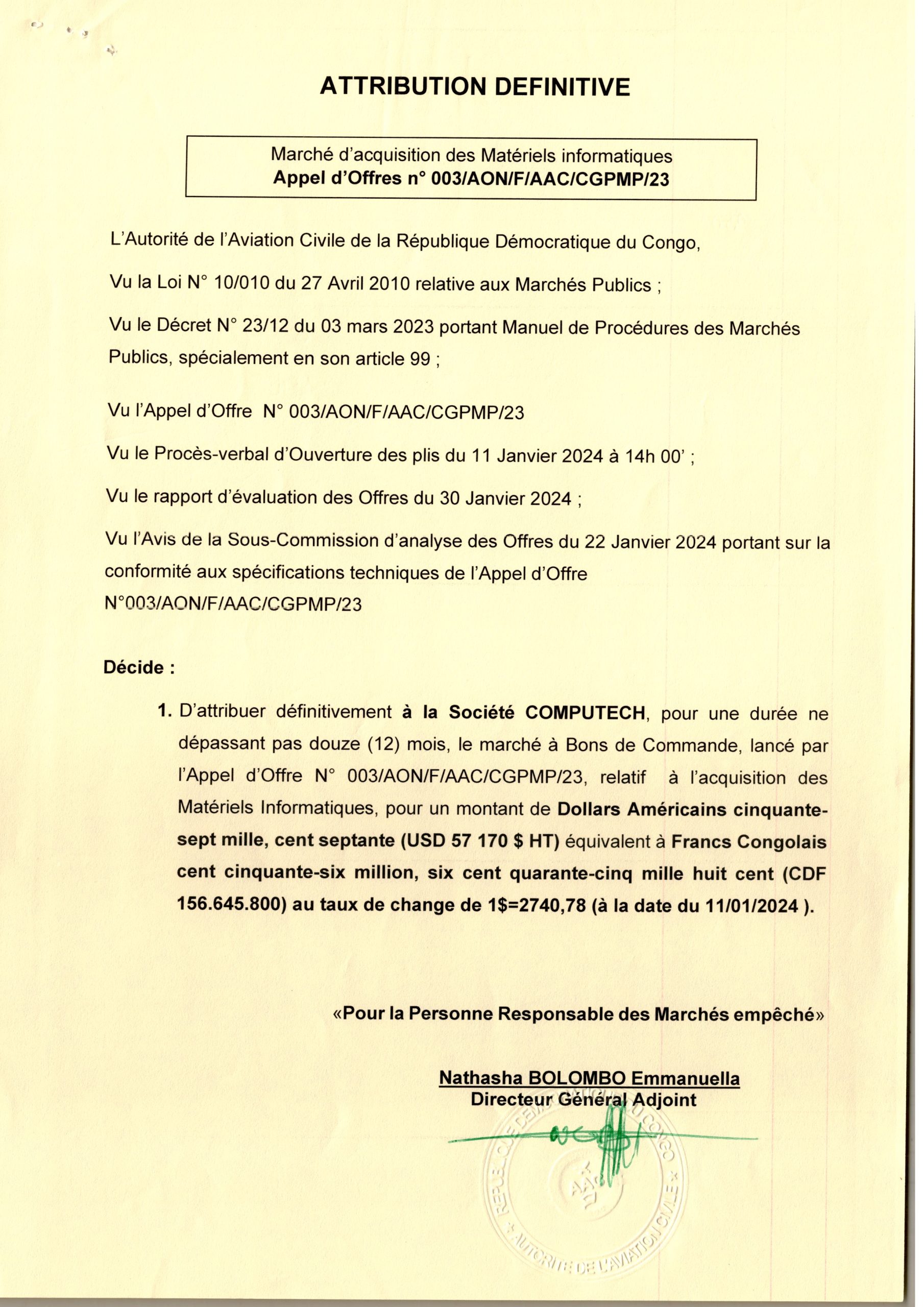 Attribution définitive du marché relatif à l’acquisition des matériels Informatiques à la société COMPUTECH