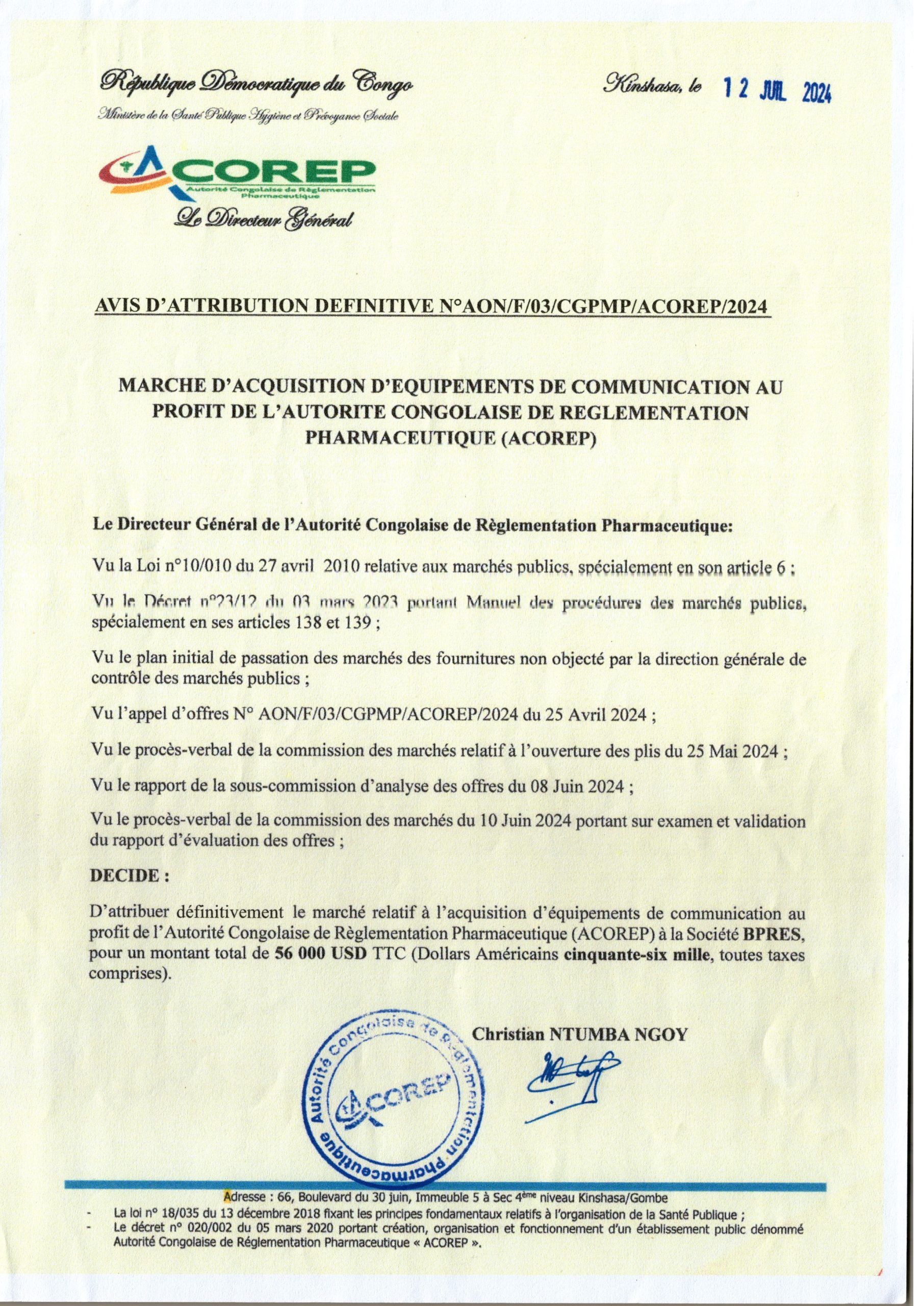 Avis d’attribution définitive accordée à la société “BPRES” le marché relatif à l’acquisition d’équipements de communication au profit de l’ACOREP.
