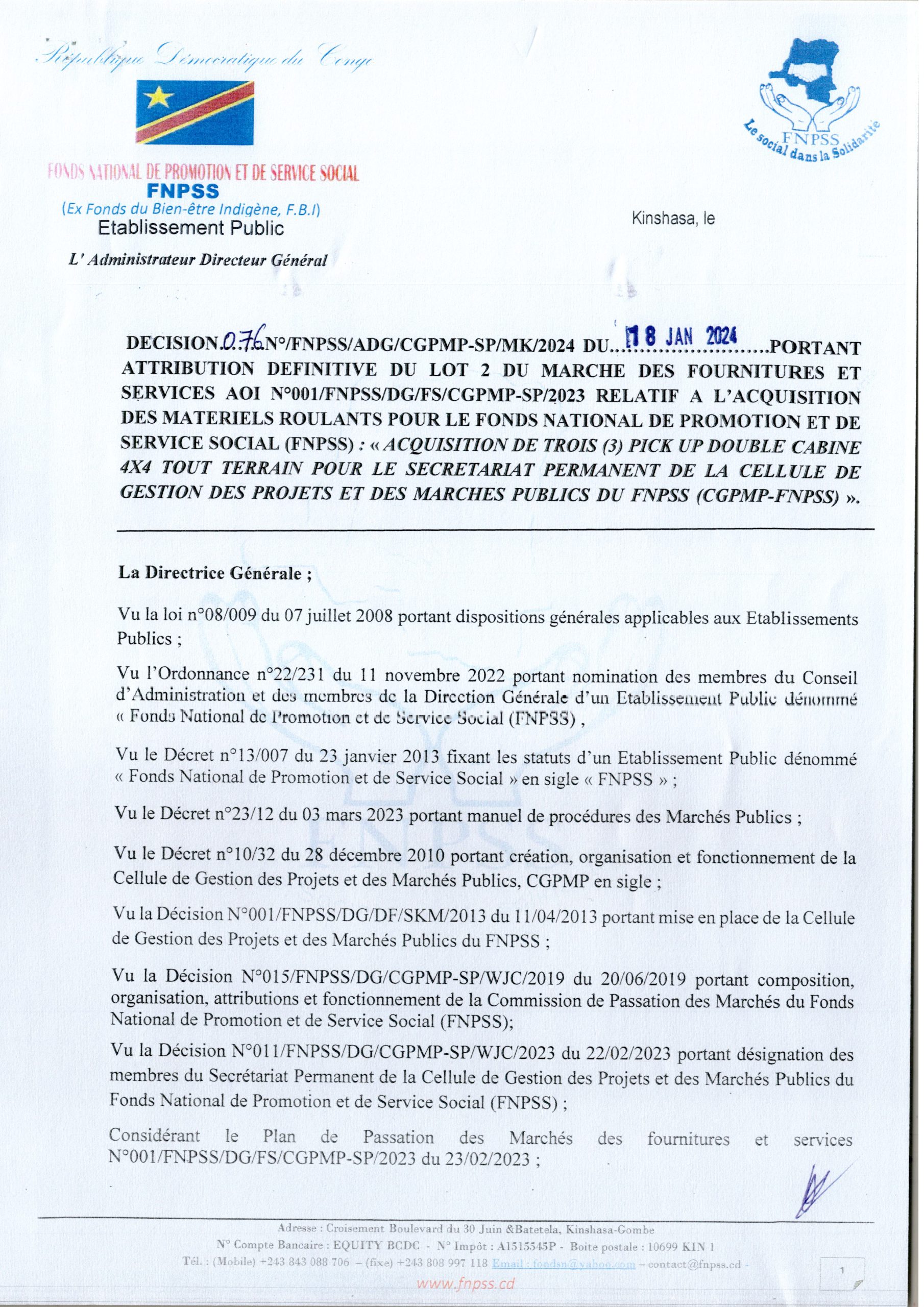 Attribution définitive du FNPSS accordée à la société PRODIMPEX relative à l’acquisition de deux (2) Pick-up double cabine 4×4 tout terrain pour l’agence Congolaise de l’Environnement …Province du HAUT-kATANGA ET LUALABA
