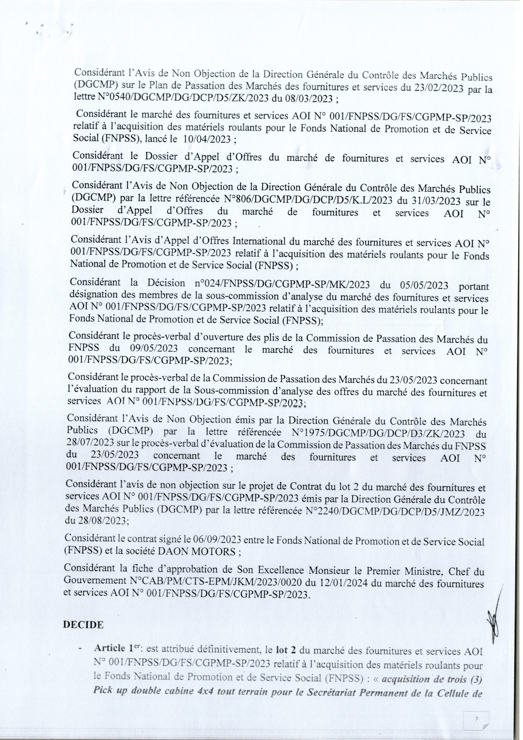 Attribution définitive du FNPSS accordée à la société DAON MOTORS relative à l’acquisition de trois (3) Pick up double cabine 4×4 tout terrain pour le Secrétariat Permanent de la Cellule de gestion des projets et des Marchés publics du FNPSS
