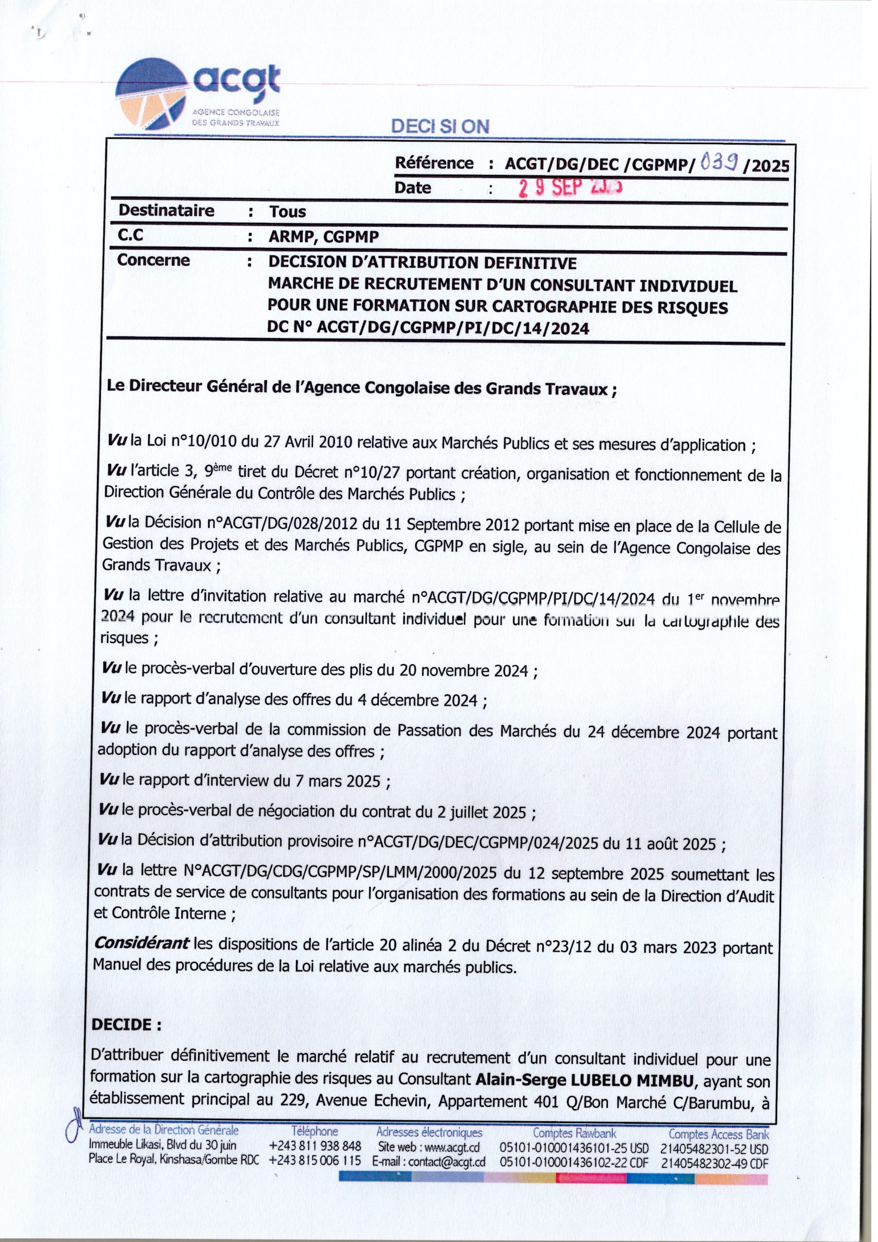 Attribution définitive accordée au consultant Alain LUBELO MIMBU relative au recrutement d’un consultant individuel pour une formation sur cartographie des risques.