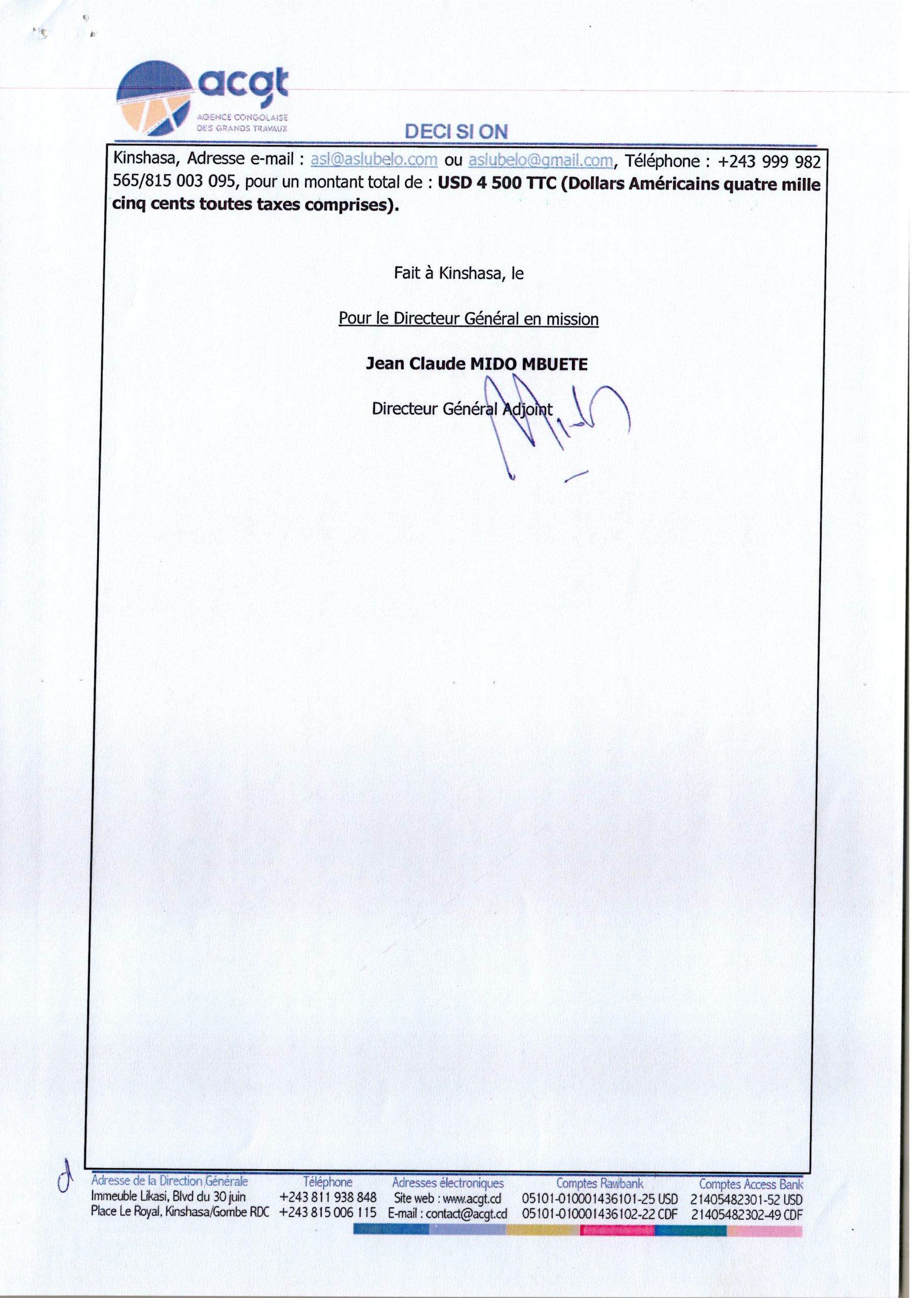 Attribution définitive accordée à l’Entreprise Georkab Service Construct “GS Construct” relative aux travaux des bureaux de la Direction Provinciale du Fonds National d’Entretien Routier (FONER) Ex-Katanga à Lubumbashi