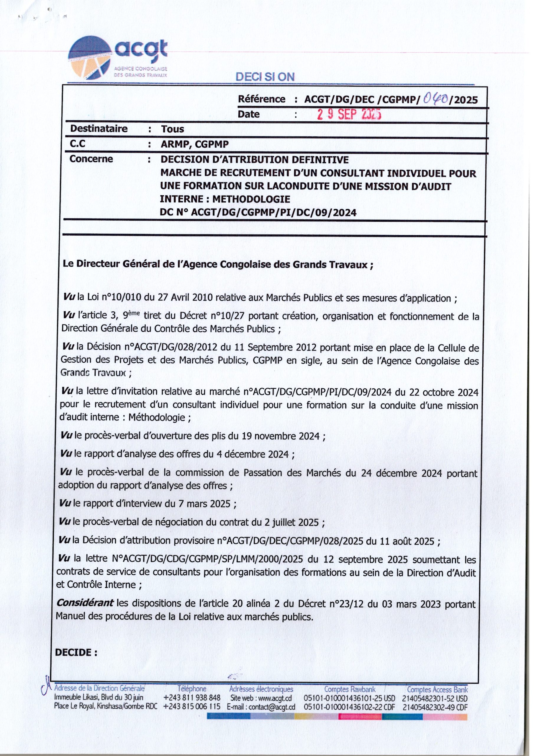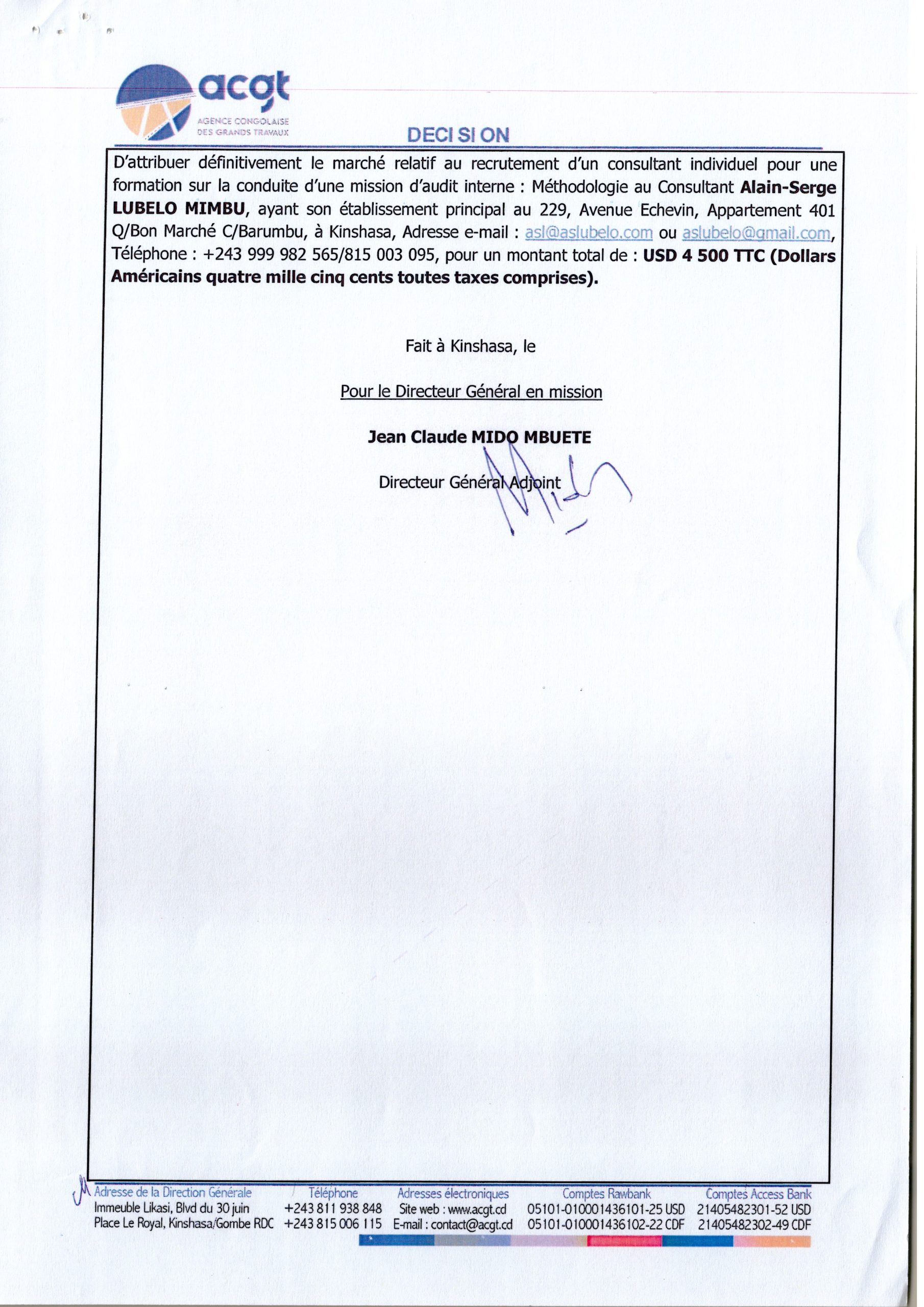 Attribution définitive accordée au consultant Alain-Serge LUBELO MIMBU relative au recrutement d’un consultant individuel pour une formation sur la conduite d’une mission d’audit interne : Méthodologie.