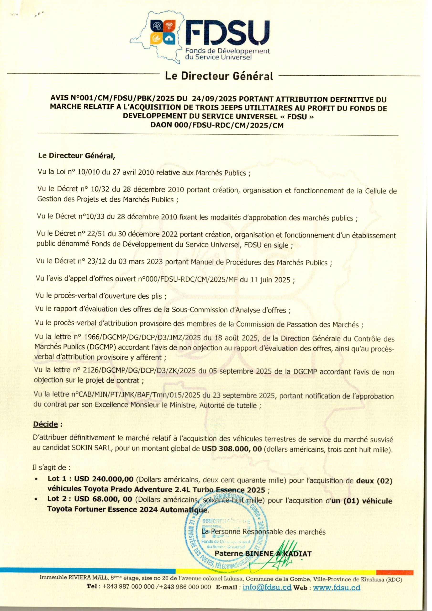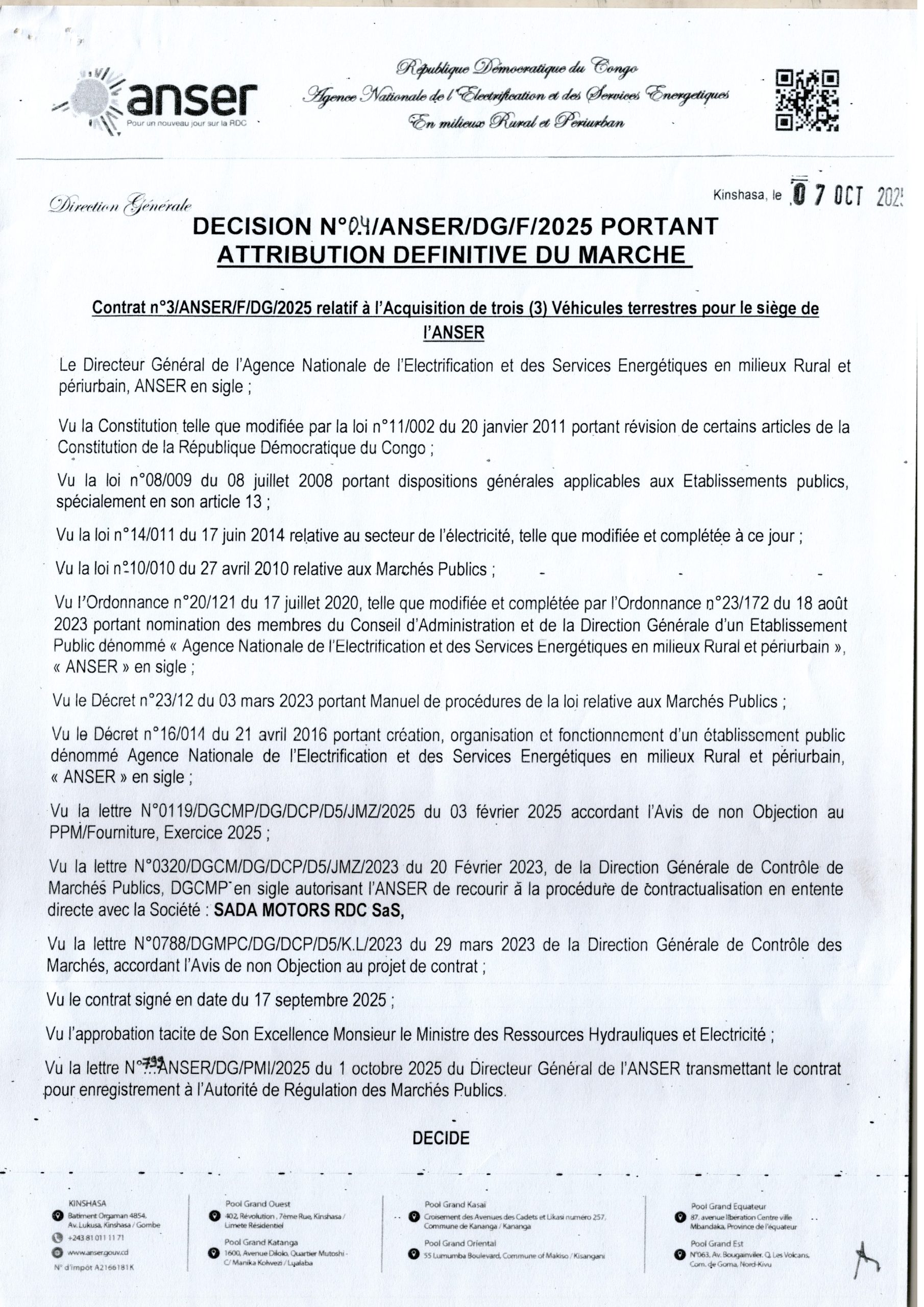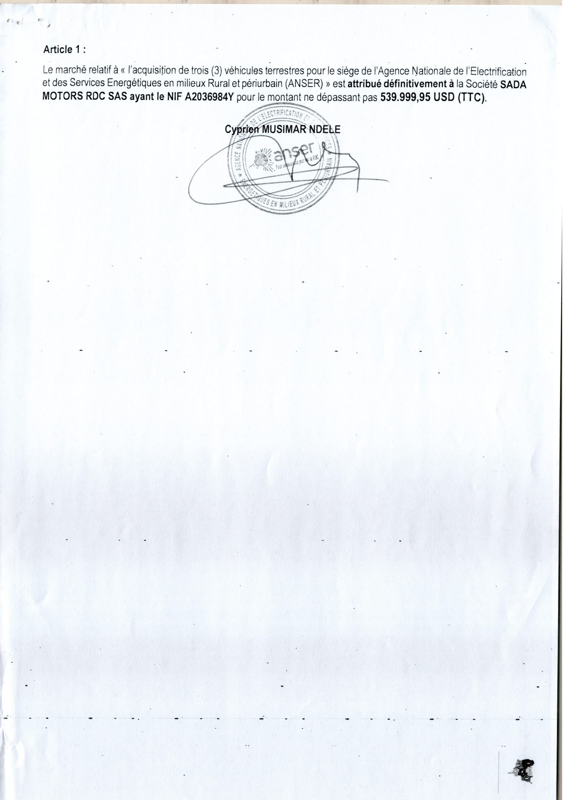 Attribution provisoire accordée à la société SADA MOTORS RDC relative à l’acquisition de trois (3) véhicules terrestres pour le siège de l’Agence Nationale de l’Électrification et des Services Energétiques en milieux Rural et périurbain (ANSER)