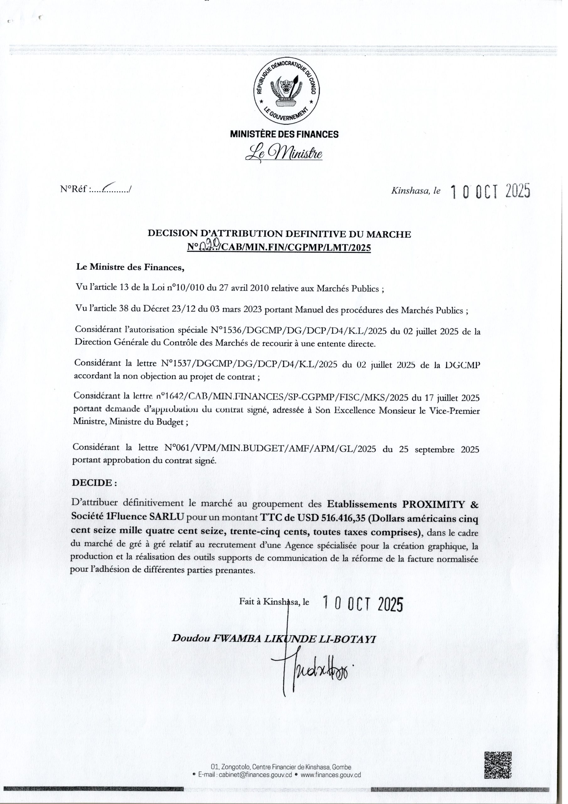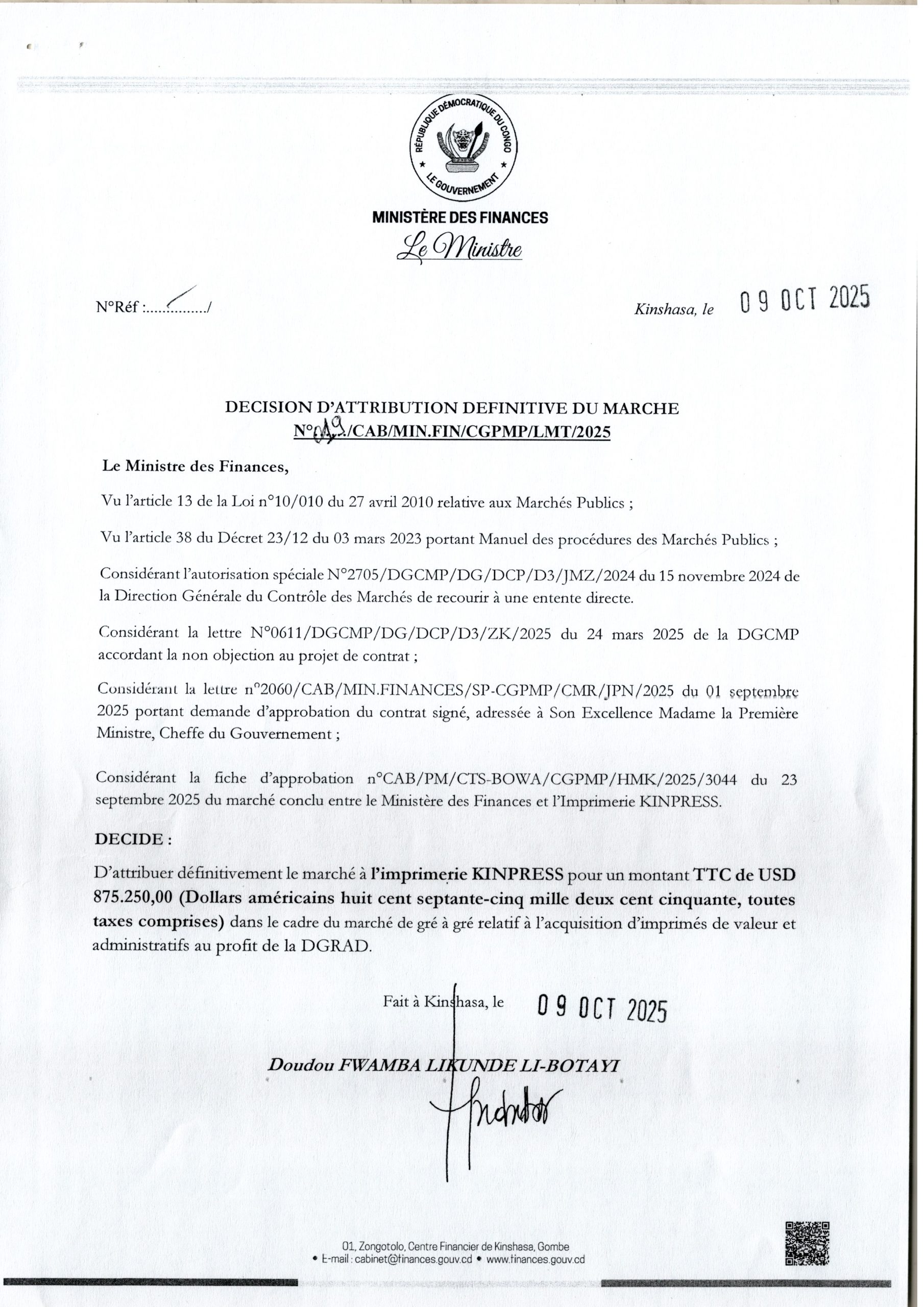 Attribution Définitive du marché à l’Imprimerie KINPRESS