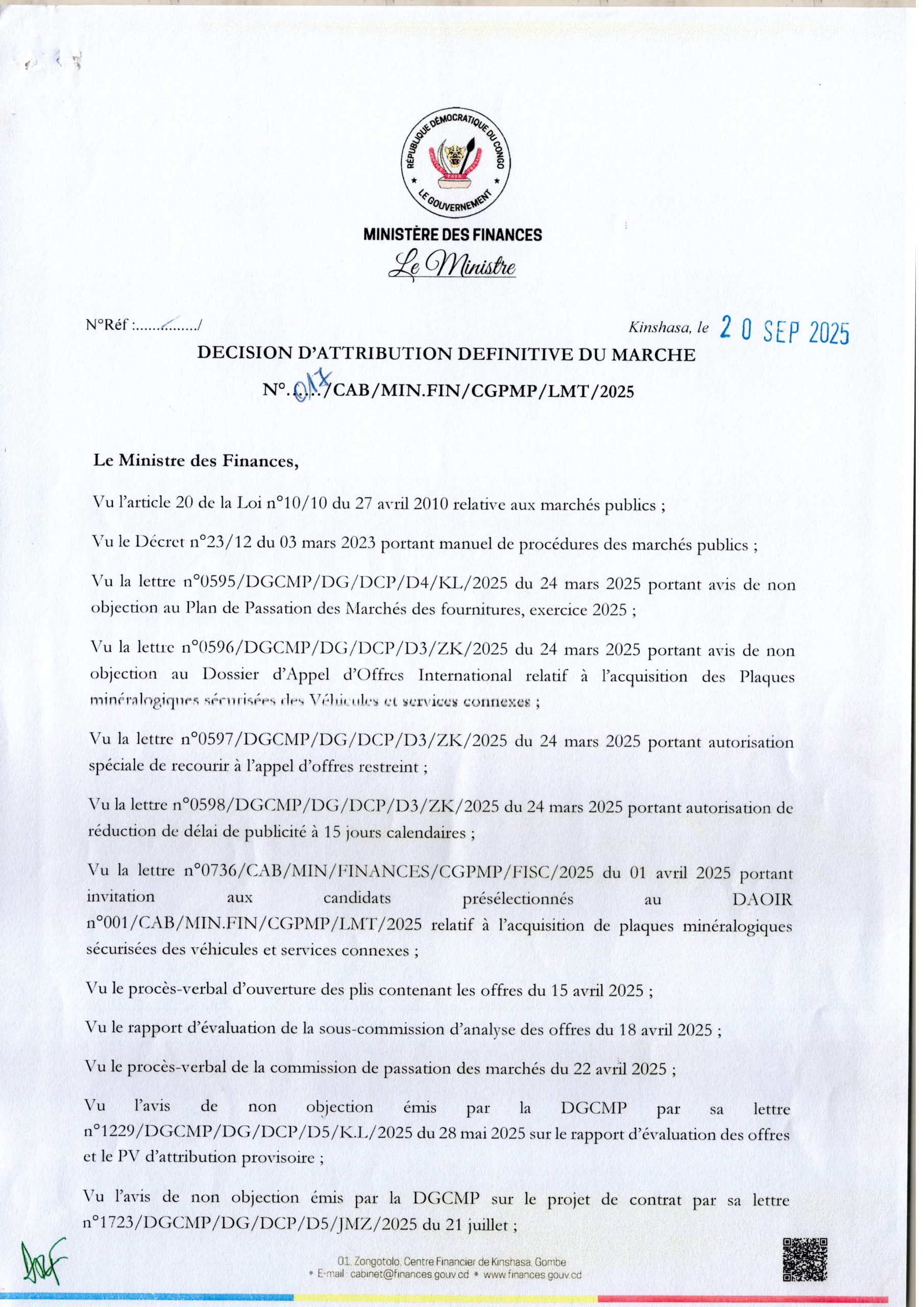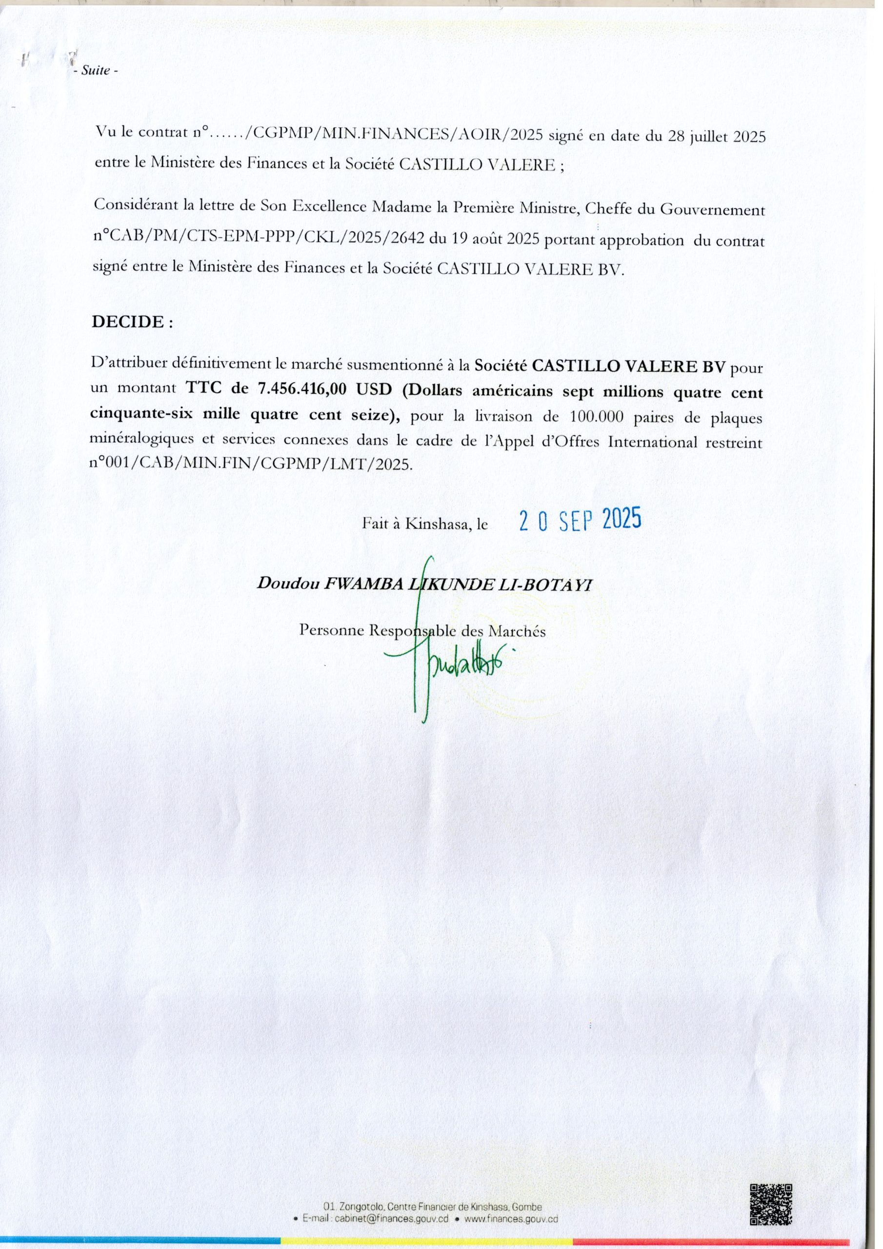 Attribution définitive accordée à la société CASTILLO VALERE BV relative à l’acquisition des Plaques minéralogiques sécurisées des Véhicules et services connexes.