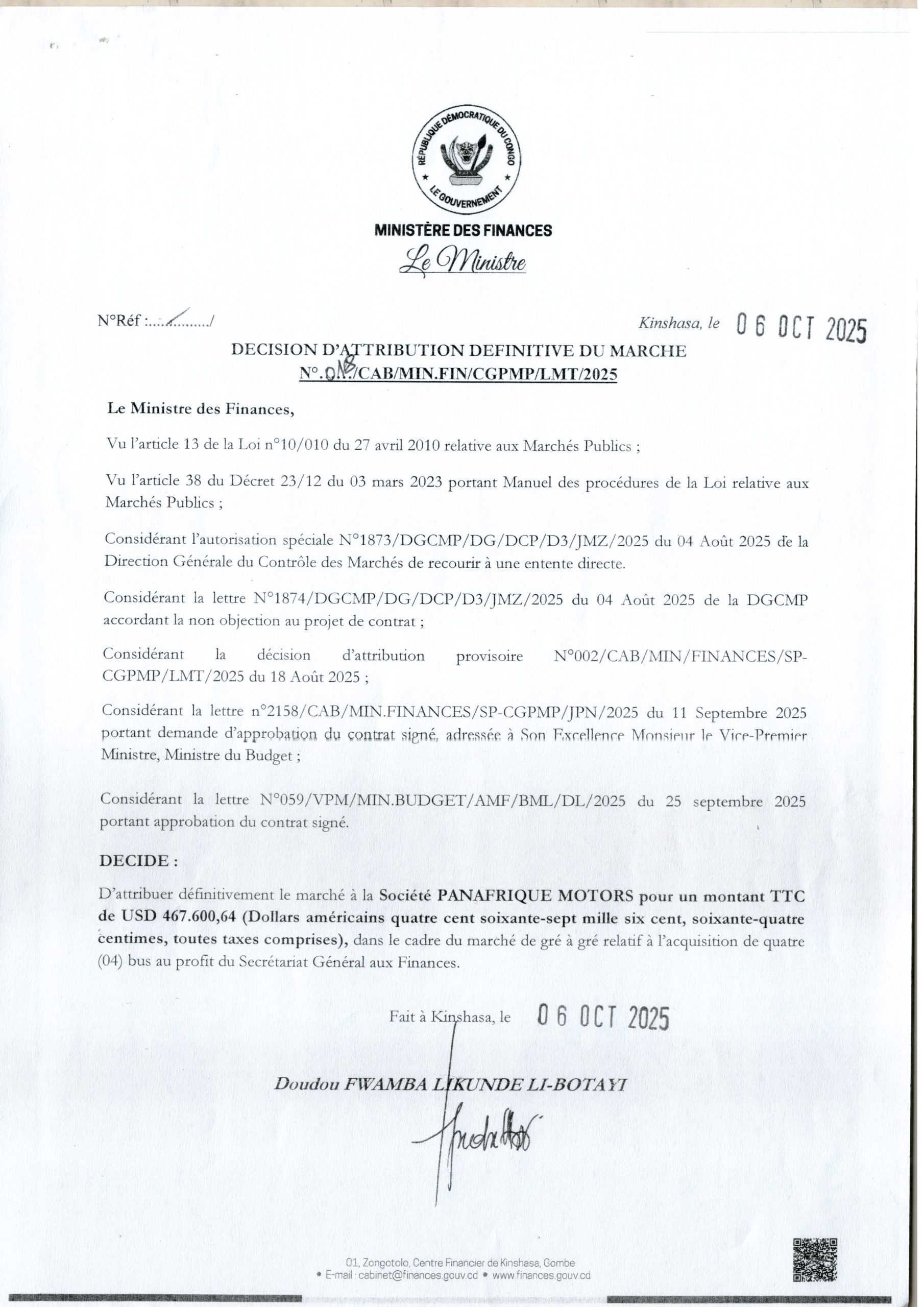 Attribution définitive accordée à la société PANAFRIQUE MOTORS relative à l’acquisition de quatre (04) bus au profit du Secrétaire général aux Finances
