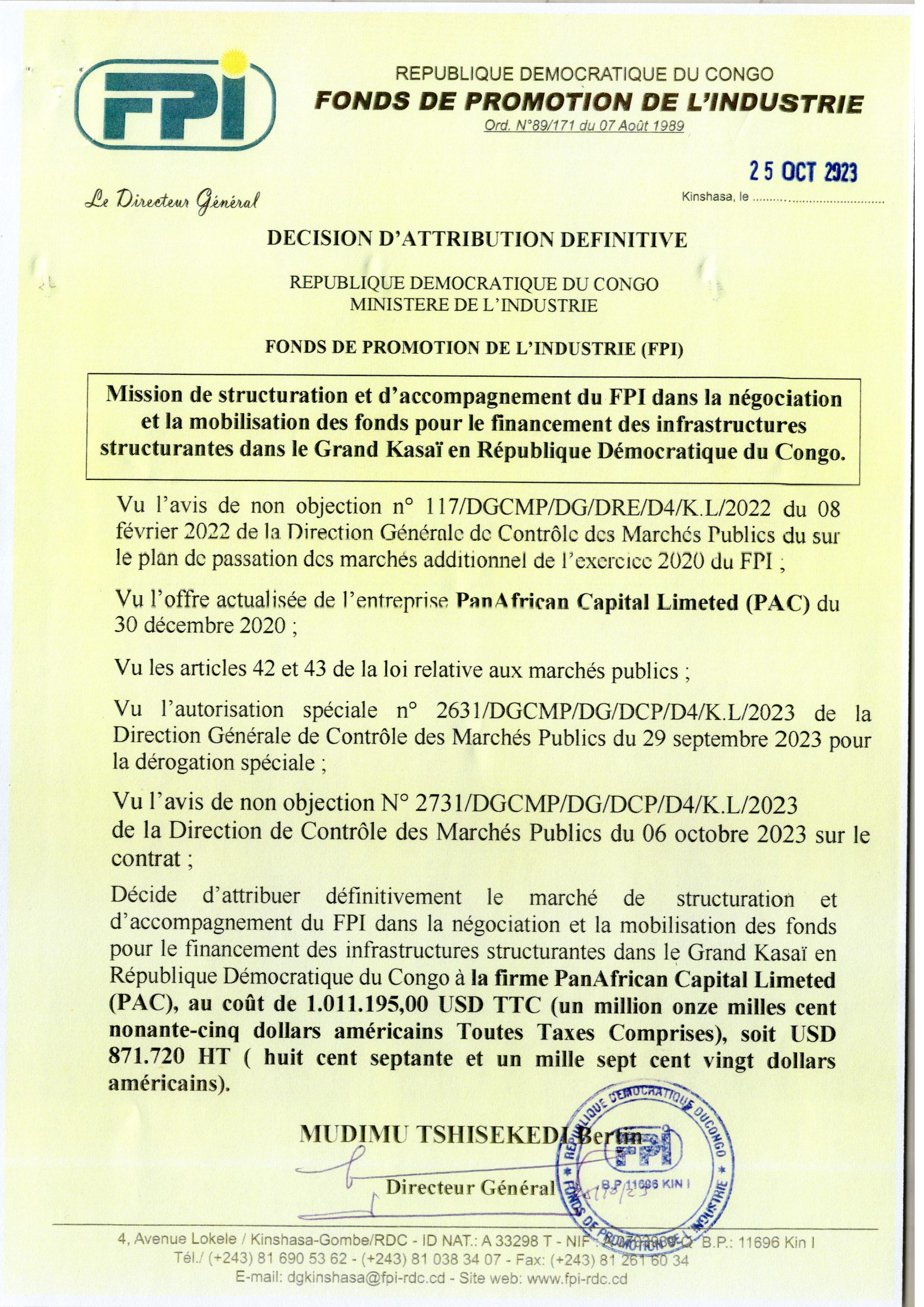 Attribution définitive de la FPI accordée relative à la Mission de structuration et d’accompagnement du FPI dans la négociation et la mobilisation de fonds pour le financement des infrastructures structurantes dans le grand Kasai en République Démocratique du Congo
