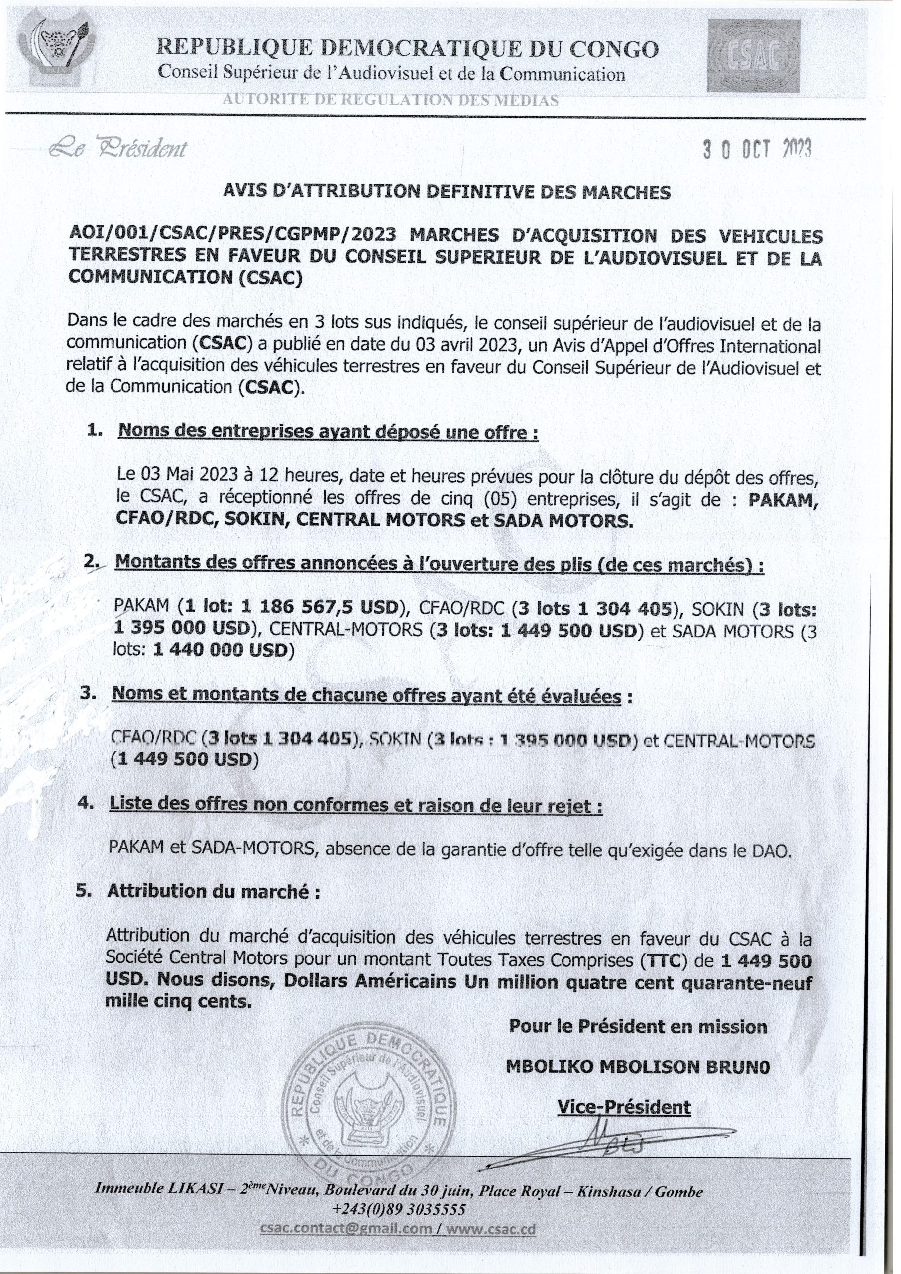 Attribution Définitive Du CSAC Accordée A La Société CENTRAL MOTORS Relative A L’acquisition Des Véhicules Terrestres En Faveur Du Conseil Supérieur De L’audiovisuel Et De La Communication (CSAC)