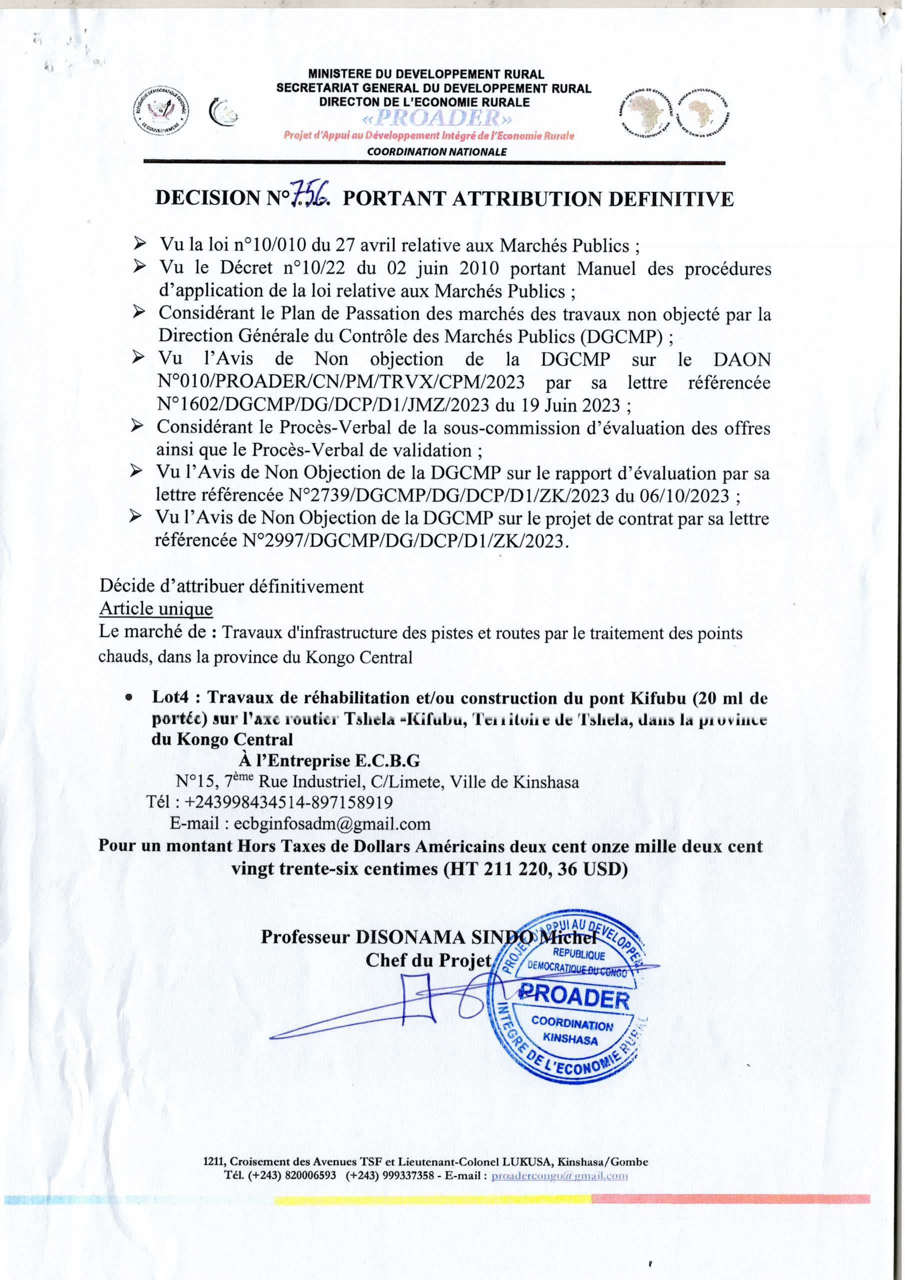 Décision d’attribution définitive du PROADER accordée à l’Entreprise E.C.B.G relative au lot 4 : travaux de réhabilitation et/ou construction du pont Kifubu (20 ml de portée) sur l’Axe routier Tshela-Kifubu, Territoire de Tshela, dans la Province du Kongo Central