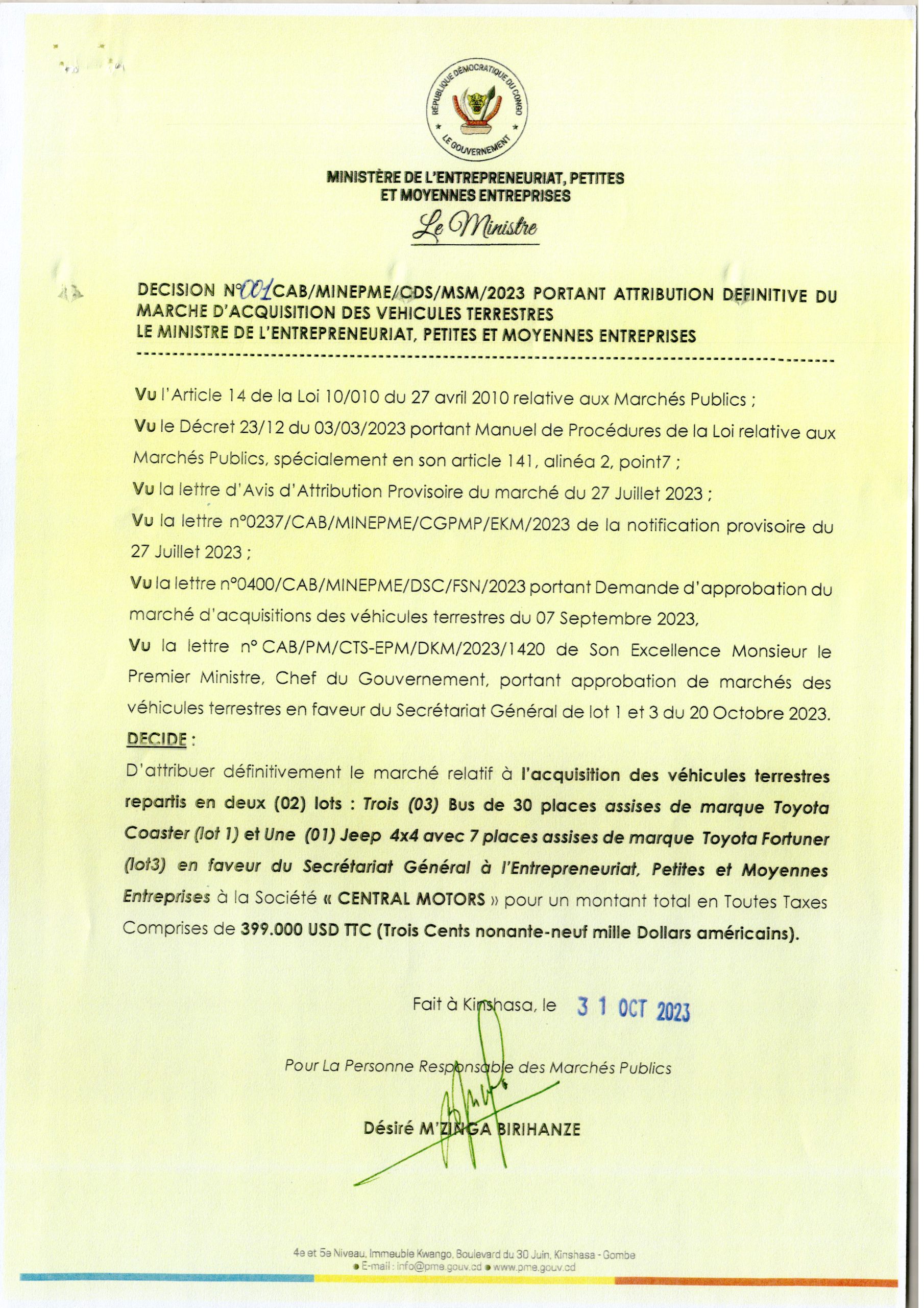ATTRIBUTION DÉFINITIVE DU MARCHÉ ACCORDÉE À LA SOCIÉTÉ CENTRAL MOTORS RELATIVE À L’ACQUISITION DES VÉHICULES TERRESTRES REPARTIS EN DEUX(02) LOTS: TROIS(03) BUS DE 30 PLACES ASSISES DE MARQUE TOYOTA COASTER (LOT 1)ET UNE (01) JEEP 4X4 AVEC…