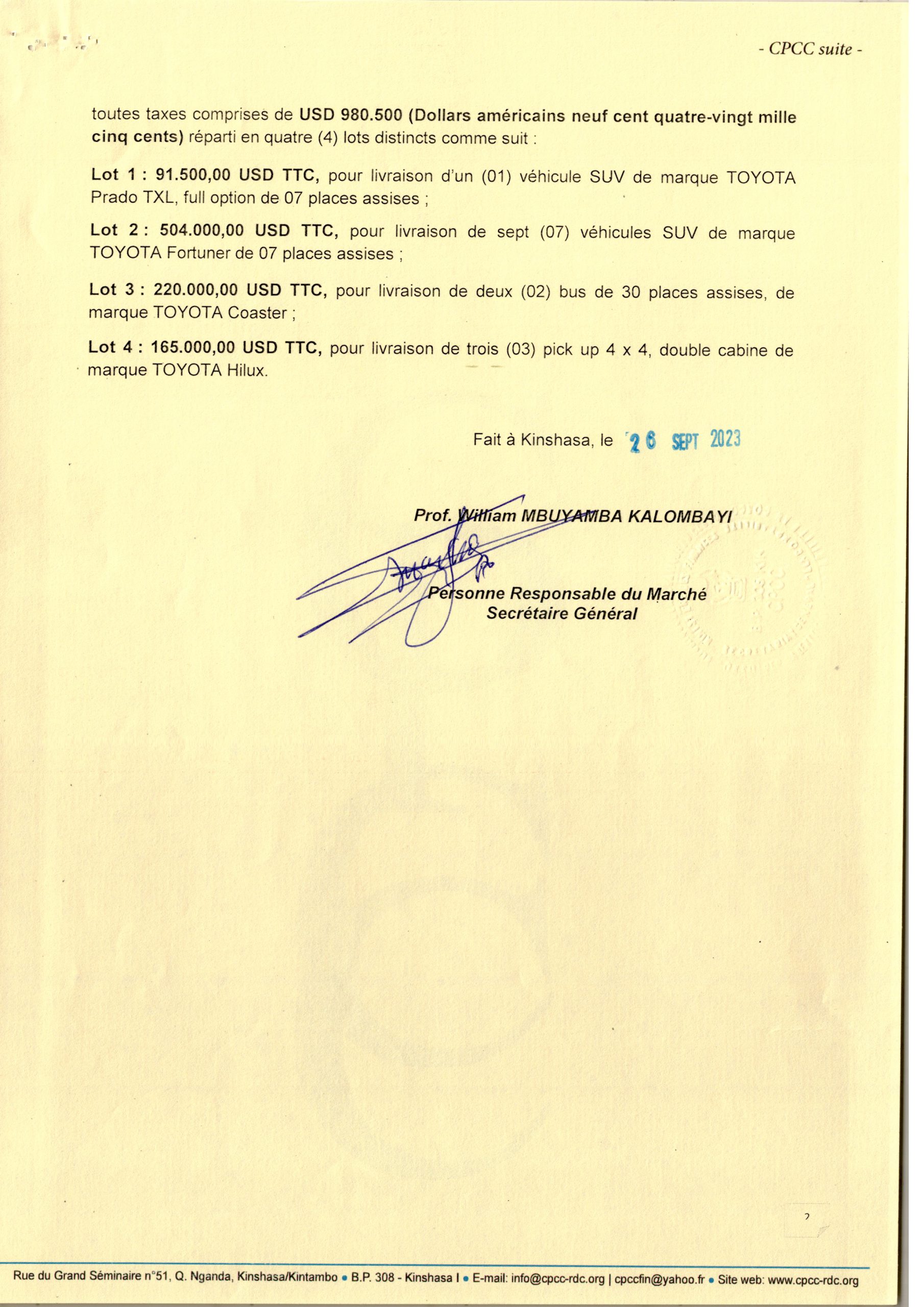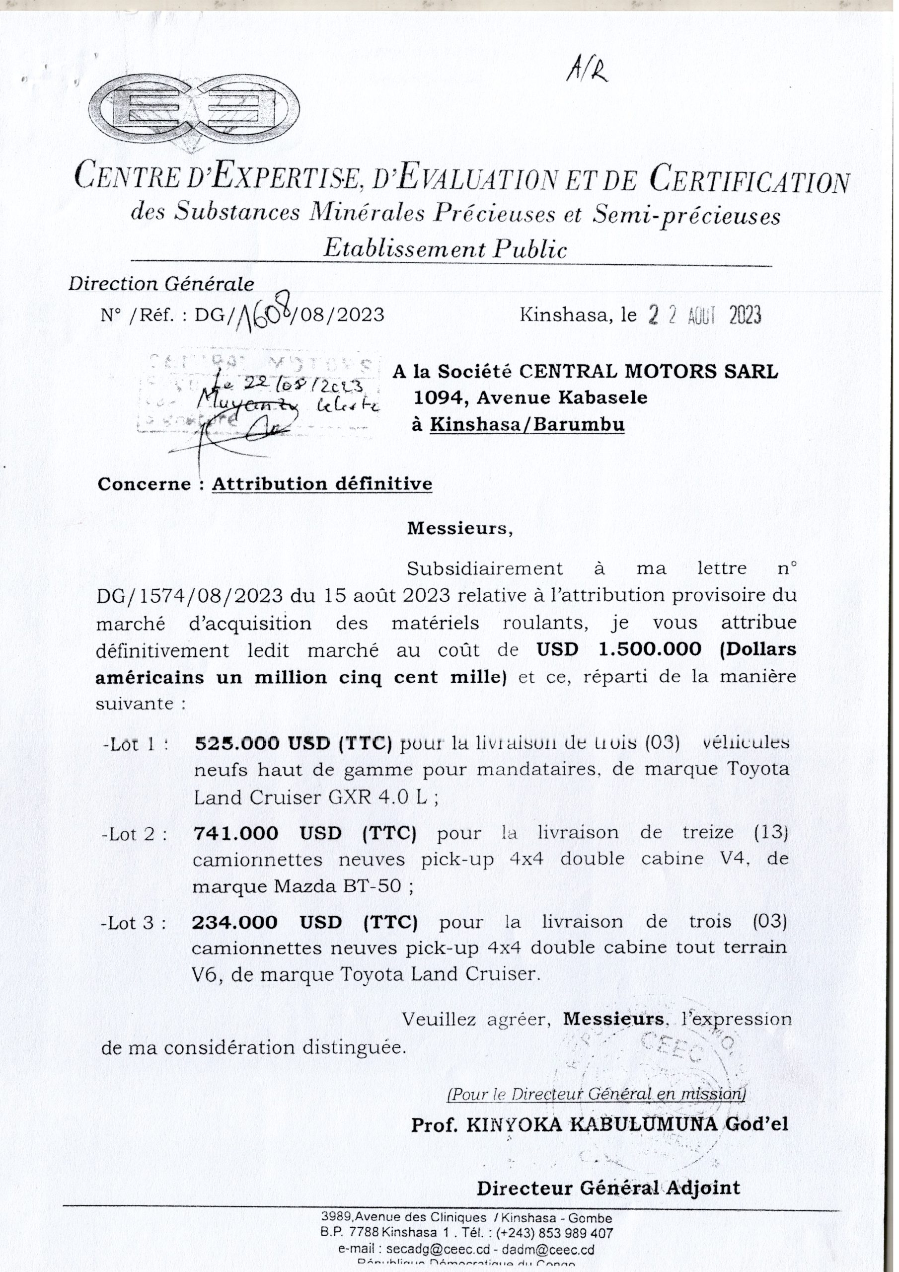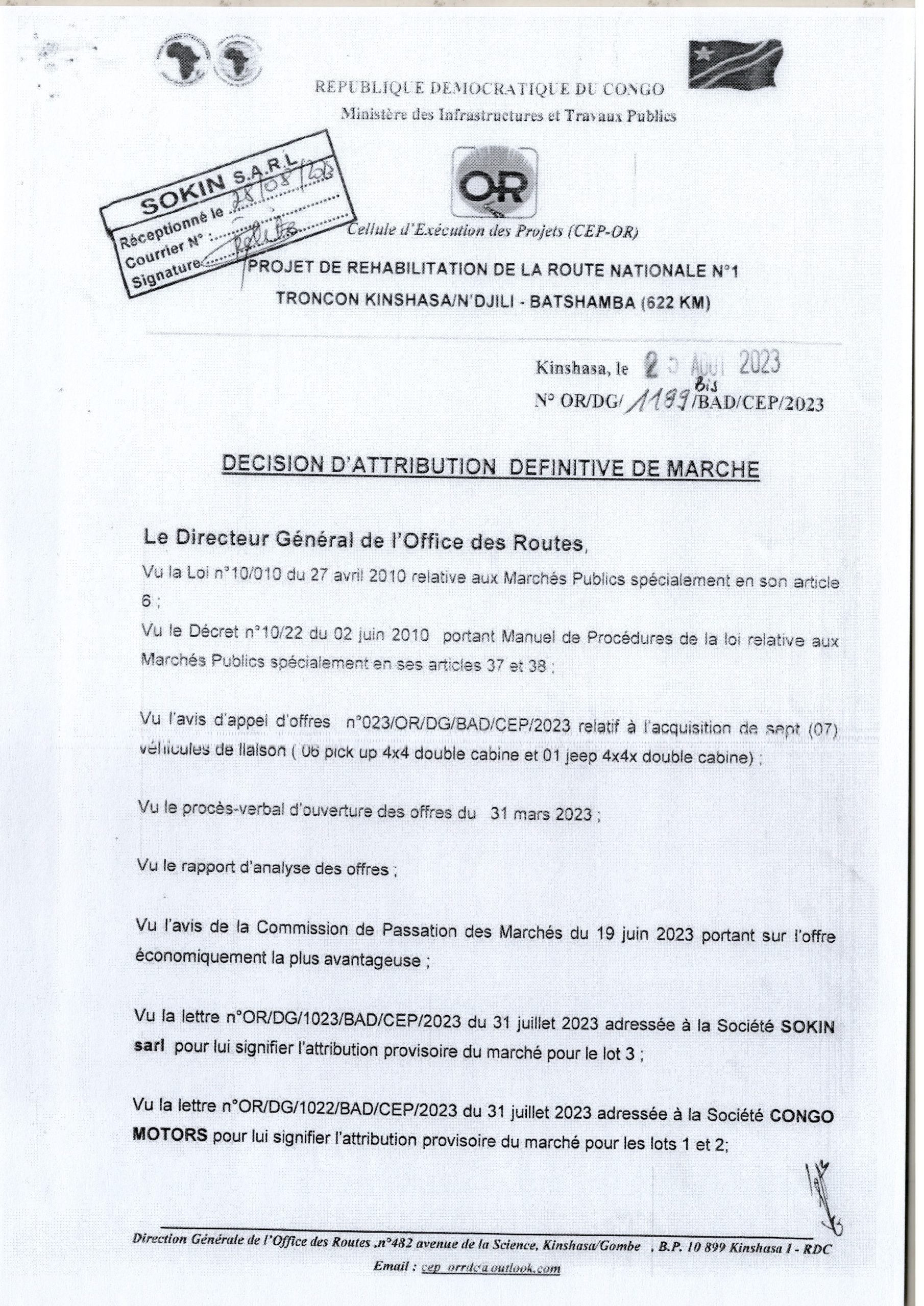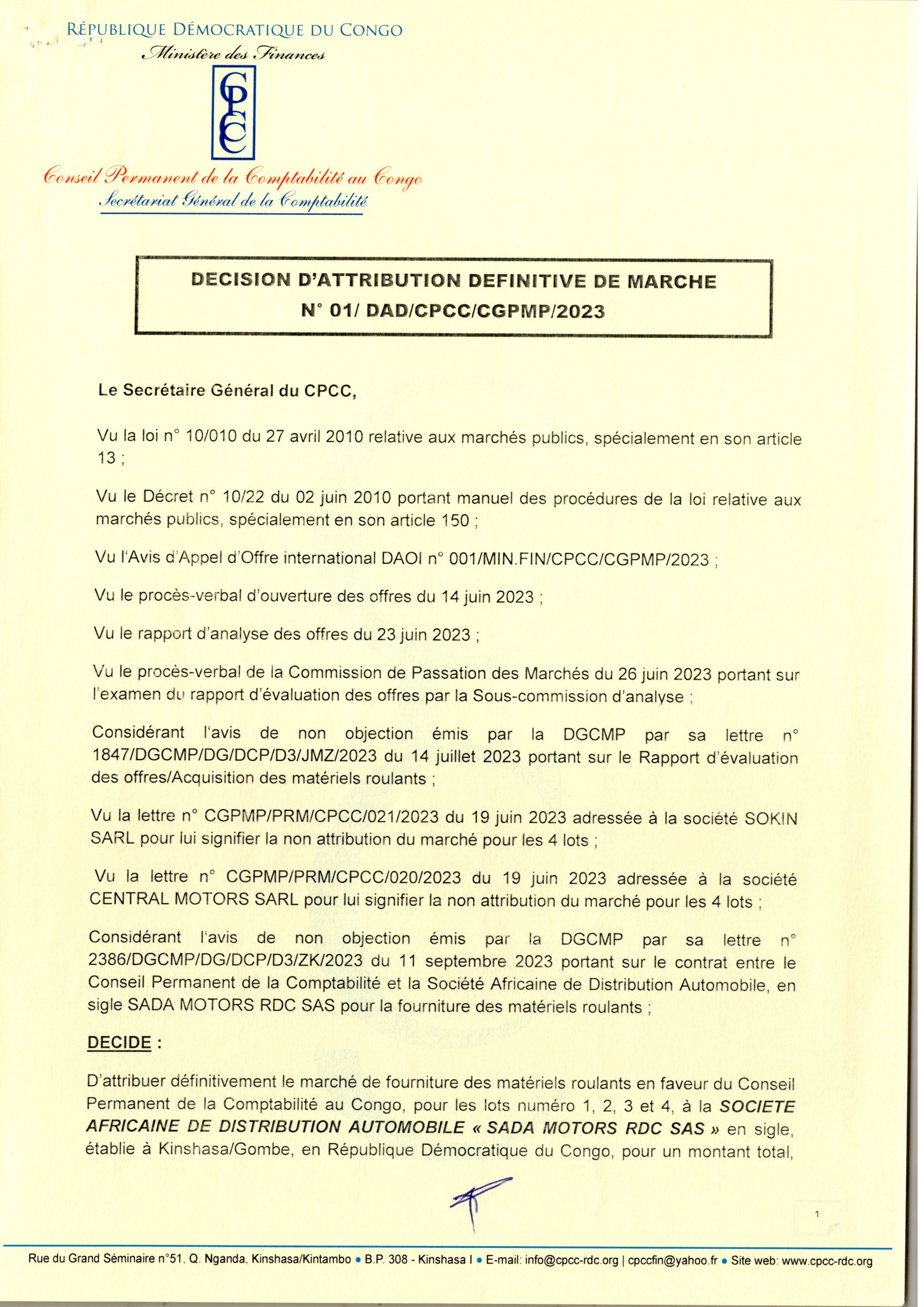 ATTRIBUTION DÉFINITIVE DE MARCHE ACCORDÉE À LA SOCIÉTÉ AFRICAINE DE DISTRIBUTION AUTOMOBILE ” SADA MOTORS RDC ” RELATIVE À LA FOURNITURE DES MATÉRIELS ROULANTS EN FAVEUR DU CONSEIL PERMANENT DE LA COMPTABILITÉ AU CONGO REPARTI EN QUATRE (4) …