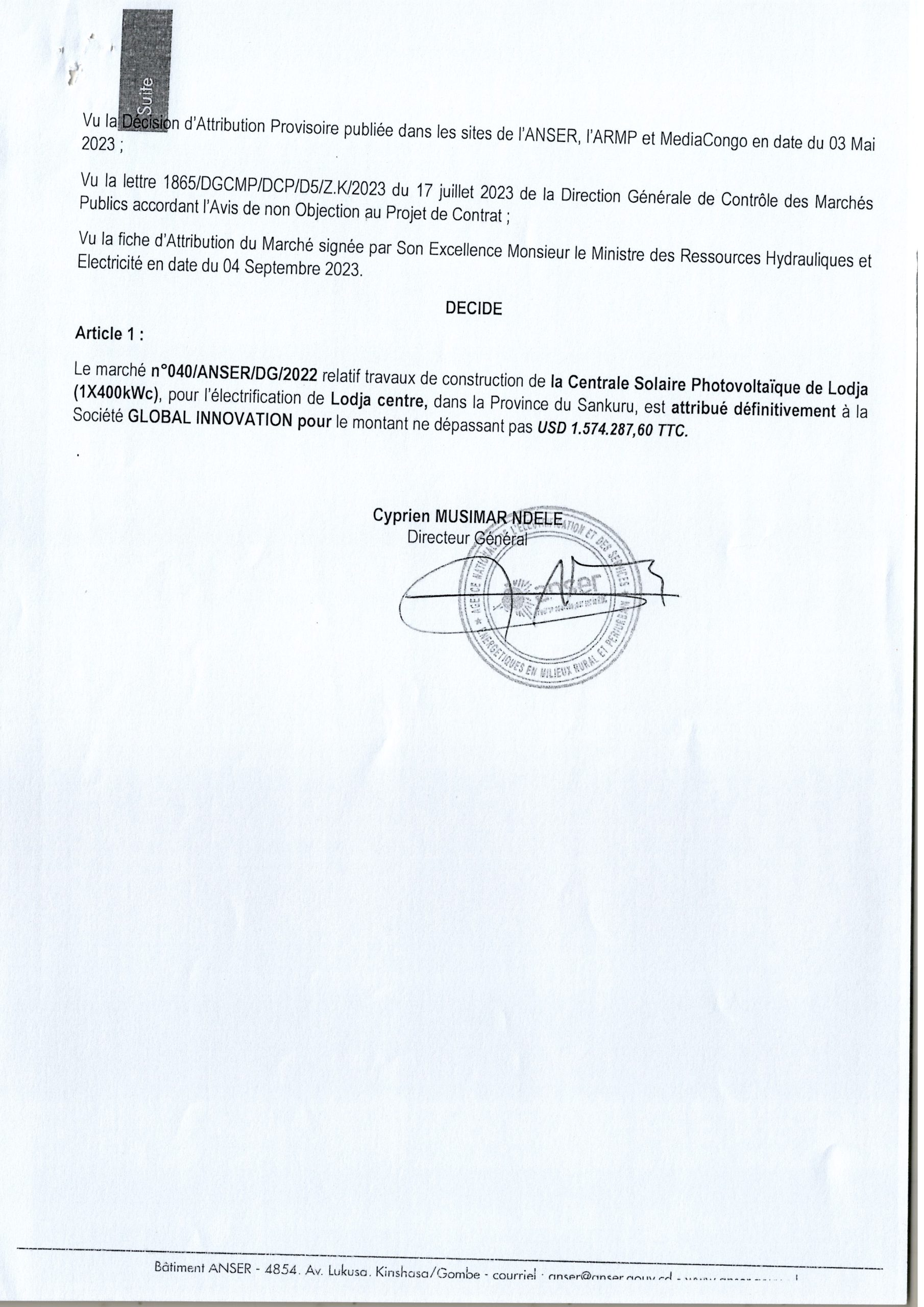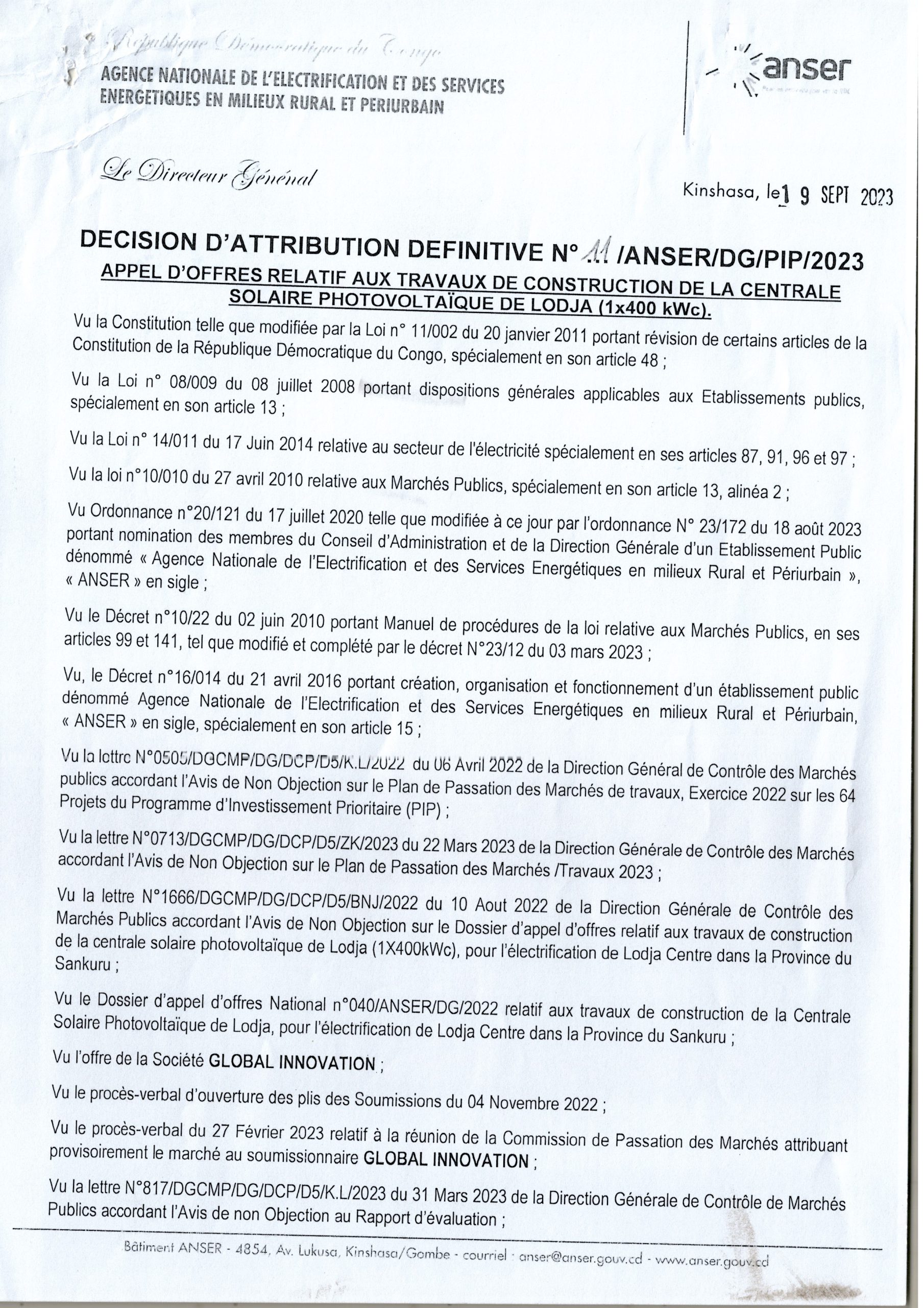 DÉCISION D’ATTRIBUTION DÉFINITIVE ACCORDÉE À LA SOCIÉTÉ GLOBAL INNOVATION RELATIVE AUX TRAVAUX DE CONSTRUCTION DE LA CENTRALE SOLAIRE PHOTOVOLTAÏQUE DE LODJA POUR L’ÉLECTRIFICATION DE LODJA CENTRE DANS LA PROVINCE …