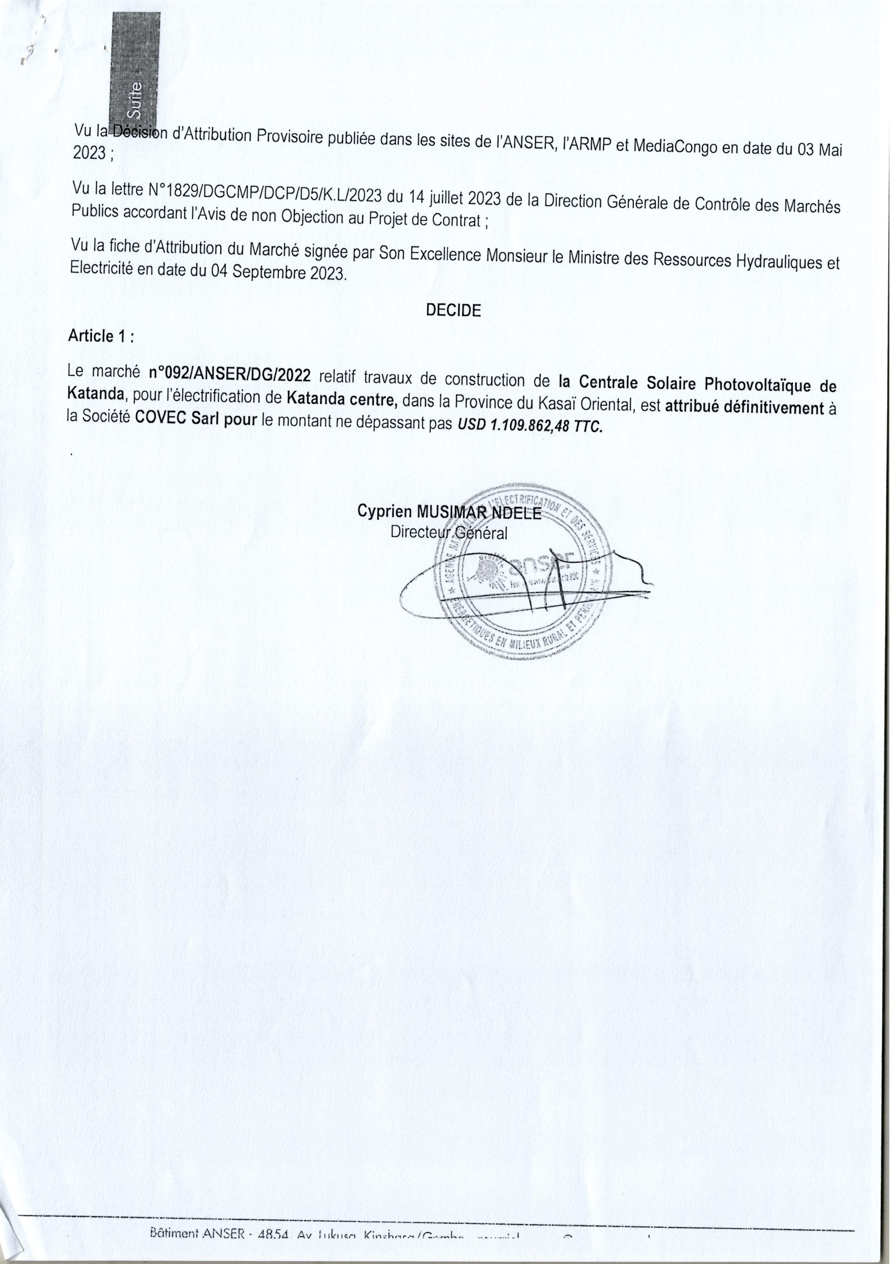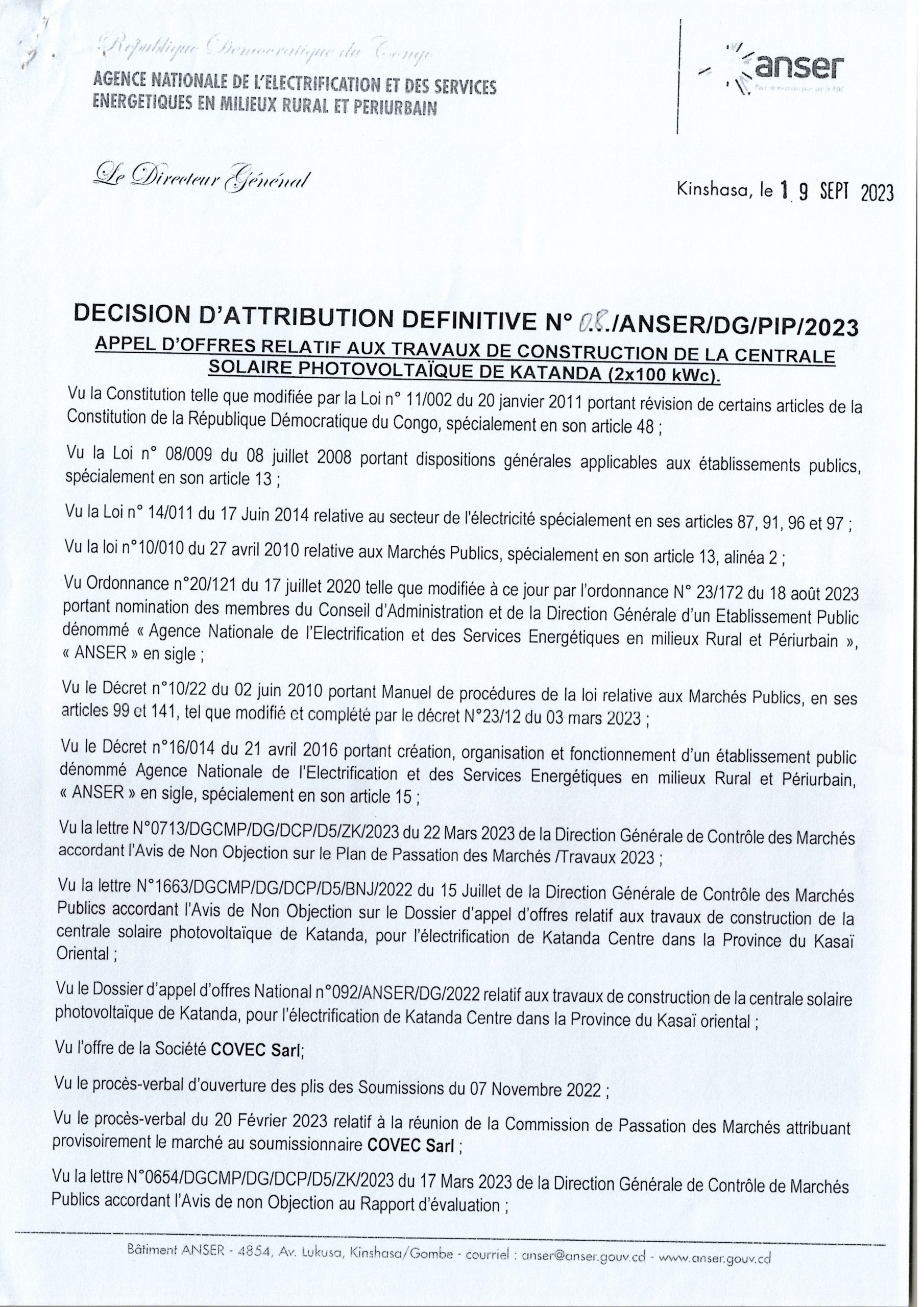 DÉCISION D’ATTRIBUTION DÉFINITIVE ACCORDÉE À LA SOCIÉTÉ COVEC SARL RELATIVE AUX TRAVAUX DE CONSTRUCTION DE LA CENTRALE SOLAIRE PHOTOVOLTAÏQUE DE KATANDA POUR L’ÉLECTRIFICATION DE KATANDA CENTRE DANS LA PROVINCE DU KASAI ORIENTAL.