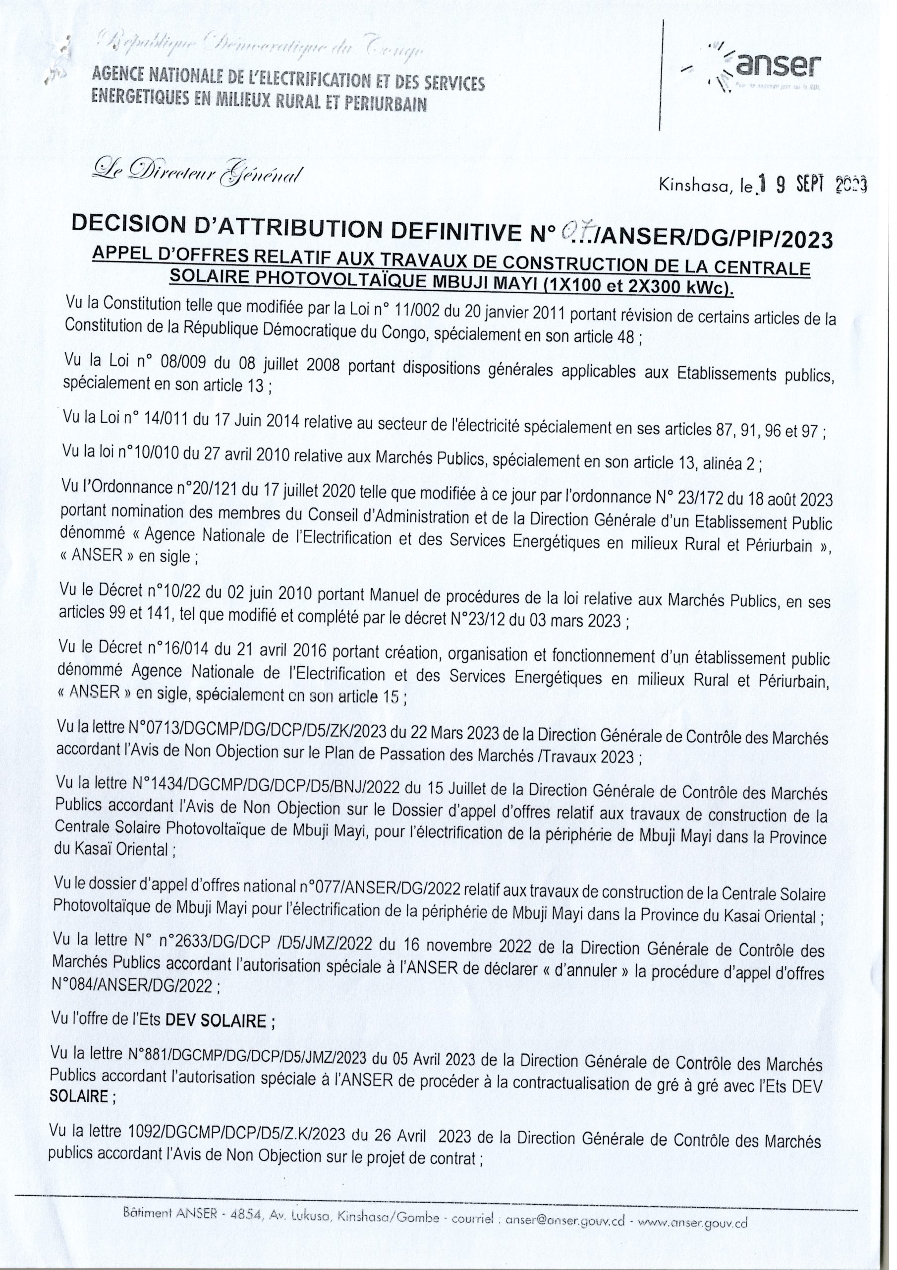 DÉCISION D’ATTRIBUTION DÉFINITIVE ACCORDÉE À L’ ETS DEV SOLAIRE RELATIVE AUX TRAVAUX DE CONSTRUCTION DE LA CENTRALE SOLAIRE PHOTOVOLTAÏQUE DE MBUJI MAYI POUR L’ÉLECTRIFICATION DE LA PÉRIPHÉRIE DE MBUJI MAYI DANS LA PROVINCE DU KASAÏ ORIENTAL.