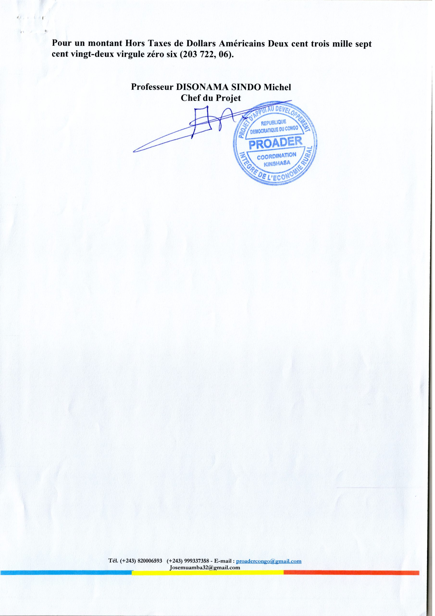 Décision d’attribution définitive du PROADER accordée à la société MALCON lot 1 relative aux Travaux /Réhabilitation …..Province du Mai-Ndombe et lot 2 à la société IRPD relative aux Travaux de Réhabilitation /Construction……Province du Congo Central