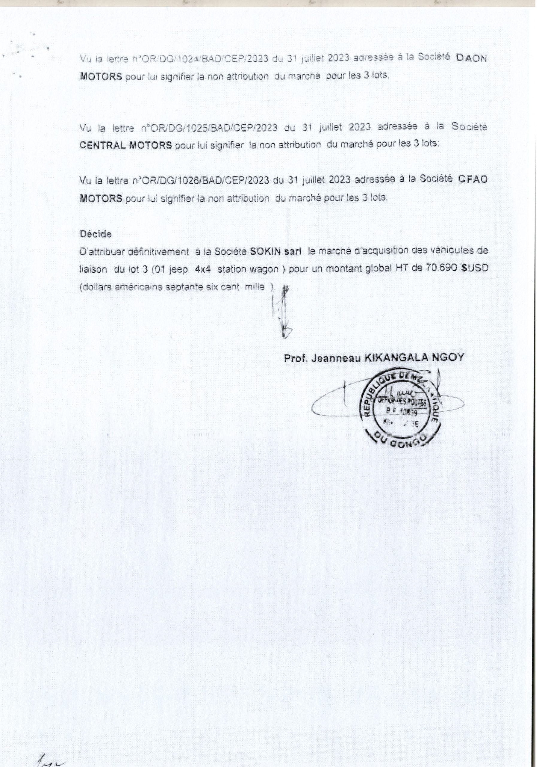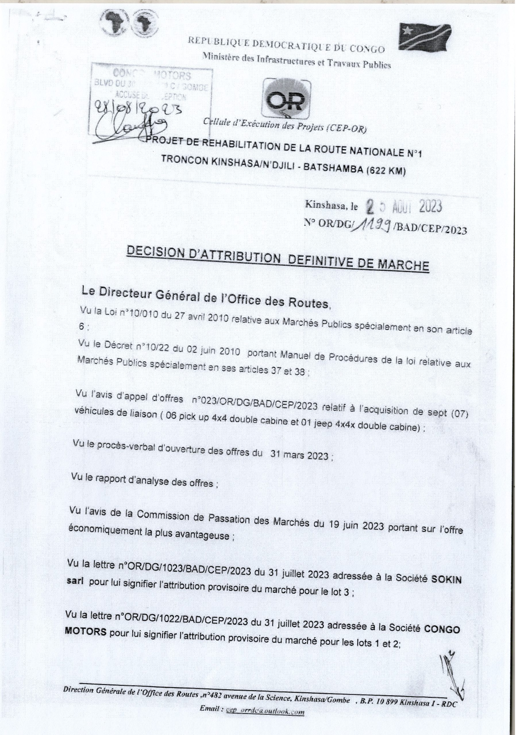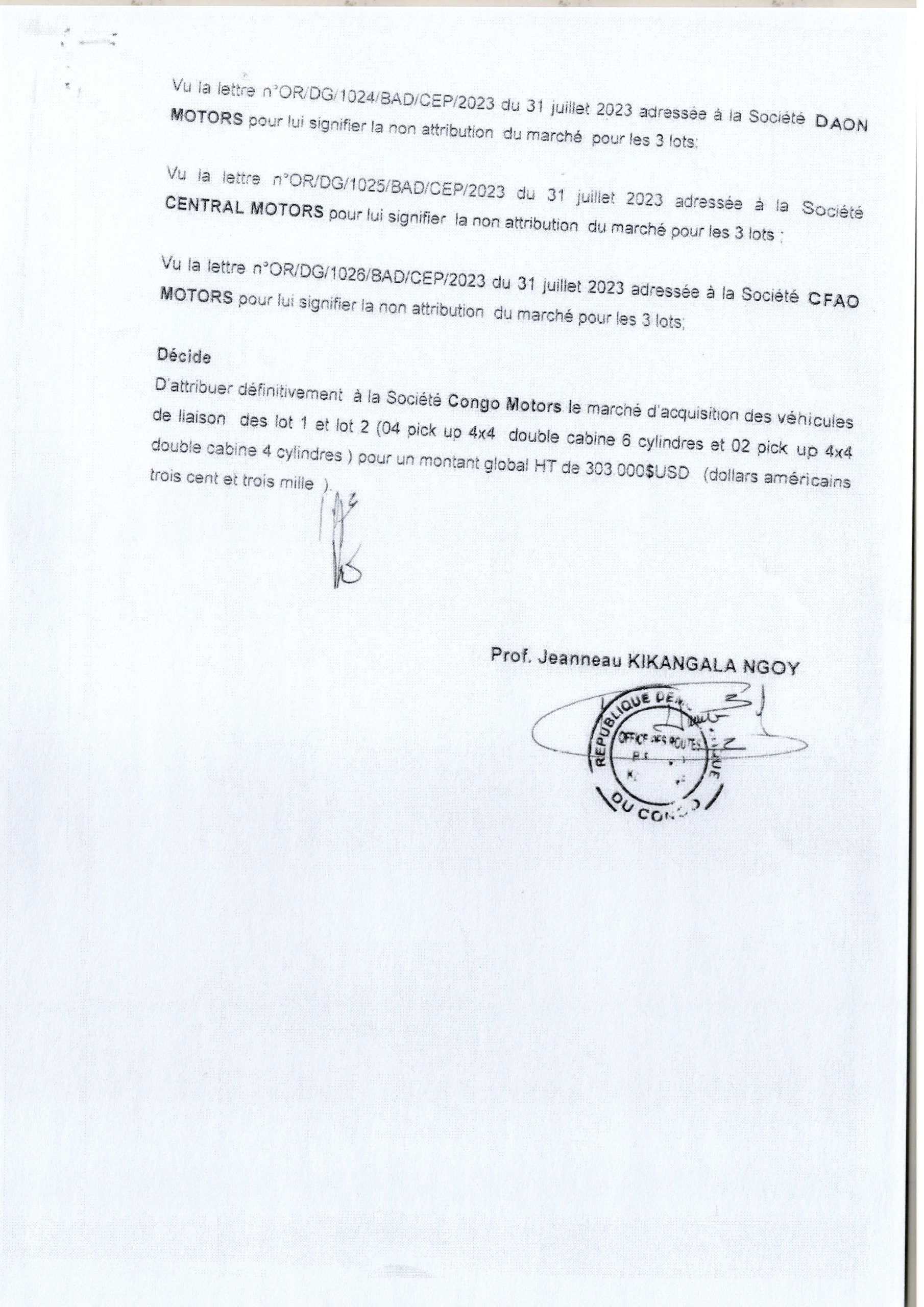 Attribution définitive de l’office des routes accordée à la société CONGO MOTORS relative à l’acquisition des véhicules de liaison des lot 1 et lot 2 (04 Pick up 4×4 double cabine 6 cylindres et 02 Pick up 4×4 double cabine 4 cylindres.