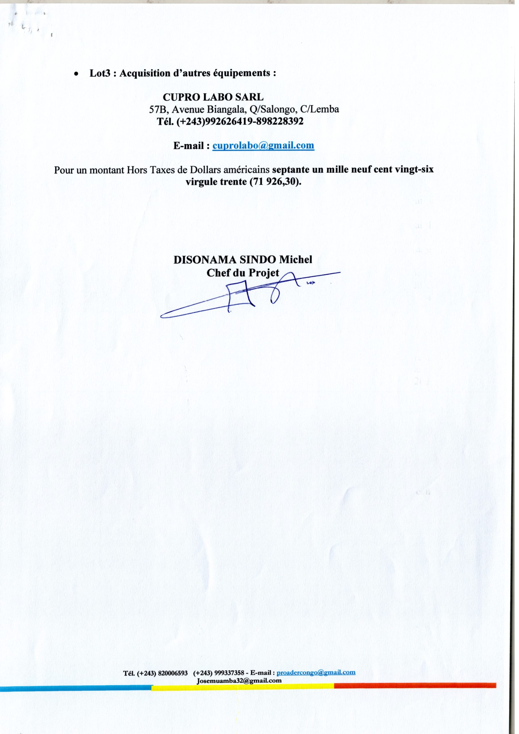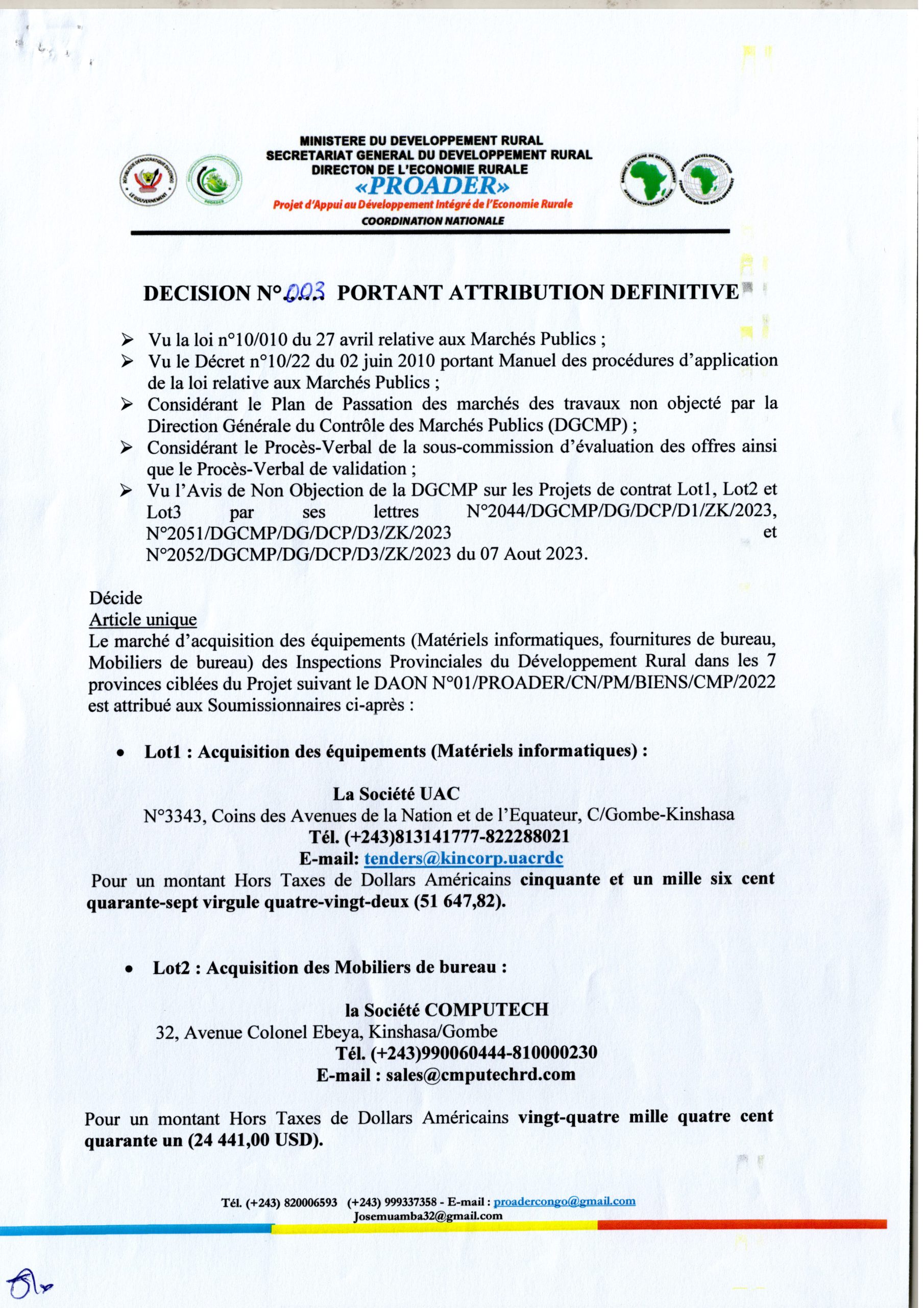 Attribution définitive de PROADER accordée à la société : Lot 1 : UAC (acquisition des équipements, matériels informatiques) ; Lot 2 : COMPUTECH (Acquisition des mobiliers de bureau) et Lot 3 : Acquisition d’autres équipements à CUPRO LABO