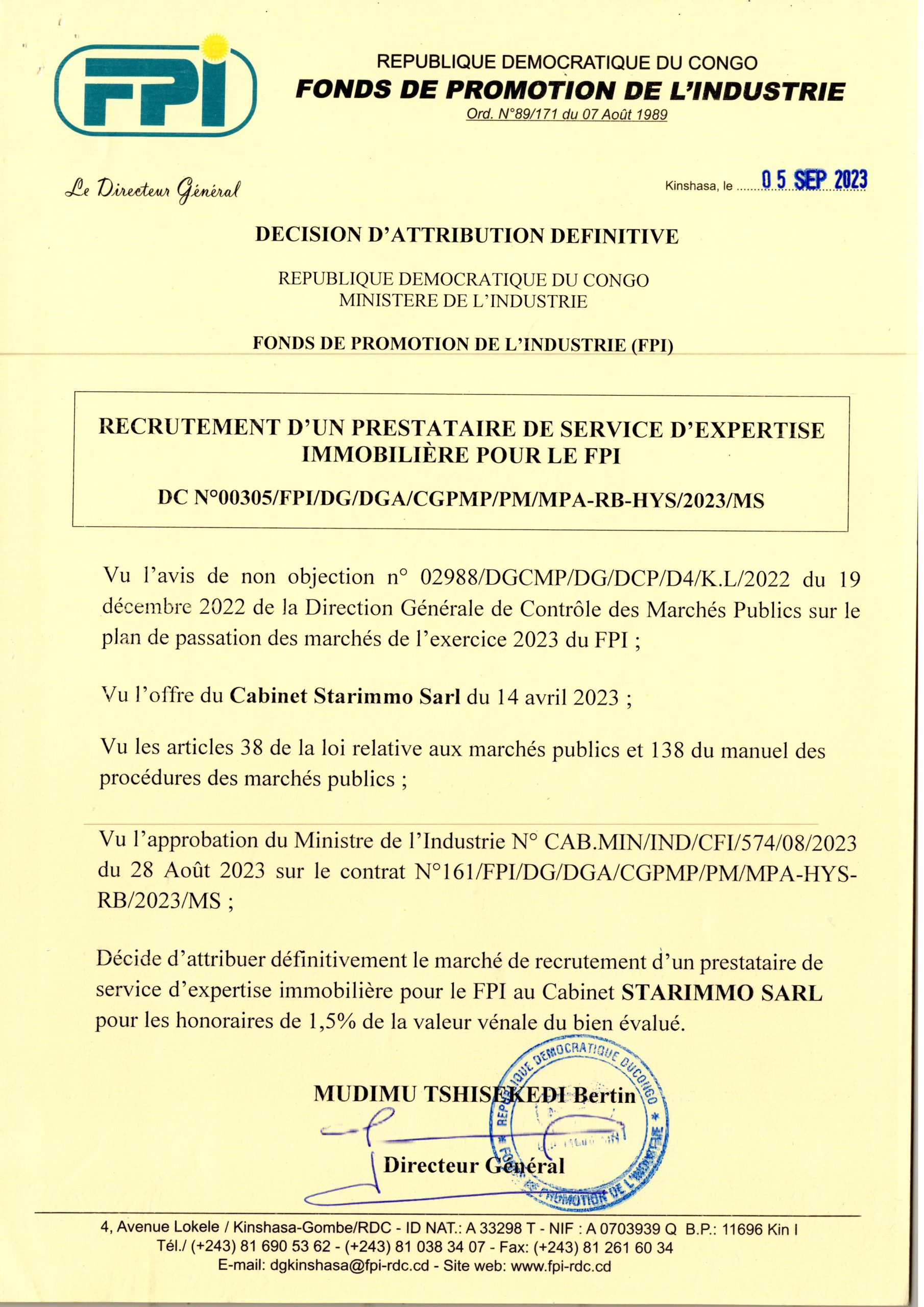 Attribution Définitive du marché relatif au recrutement d’un prestataire de servi d’expertise Immobilière pour le FPI au Cabinet STARIMMO SARL