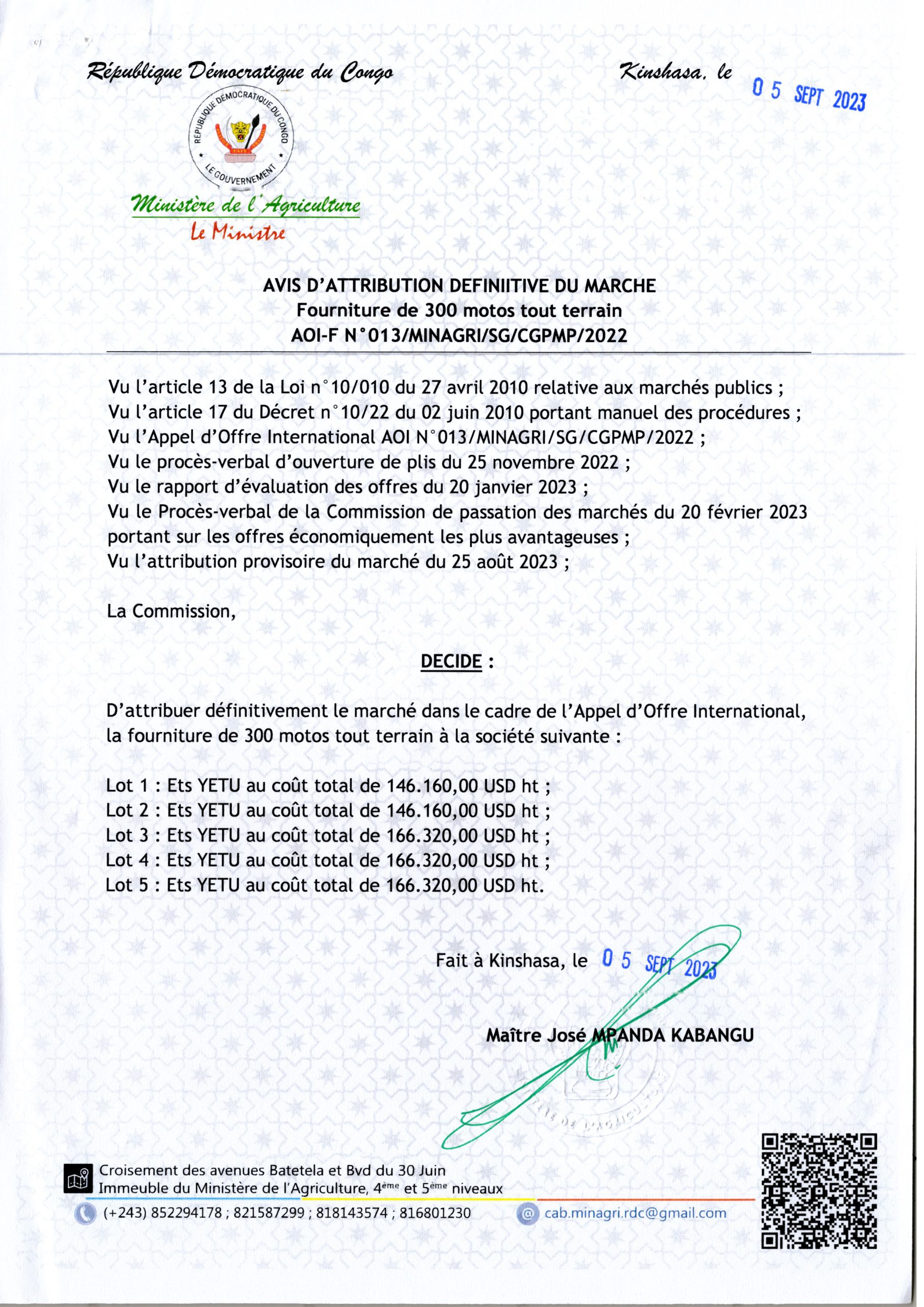 Attribution Définitive du marché relatif à la fourniture de 300 motos tout terrain en 5 lot à la société Ets YETU