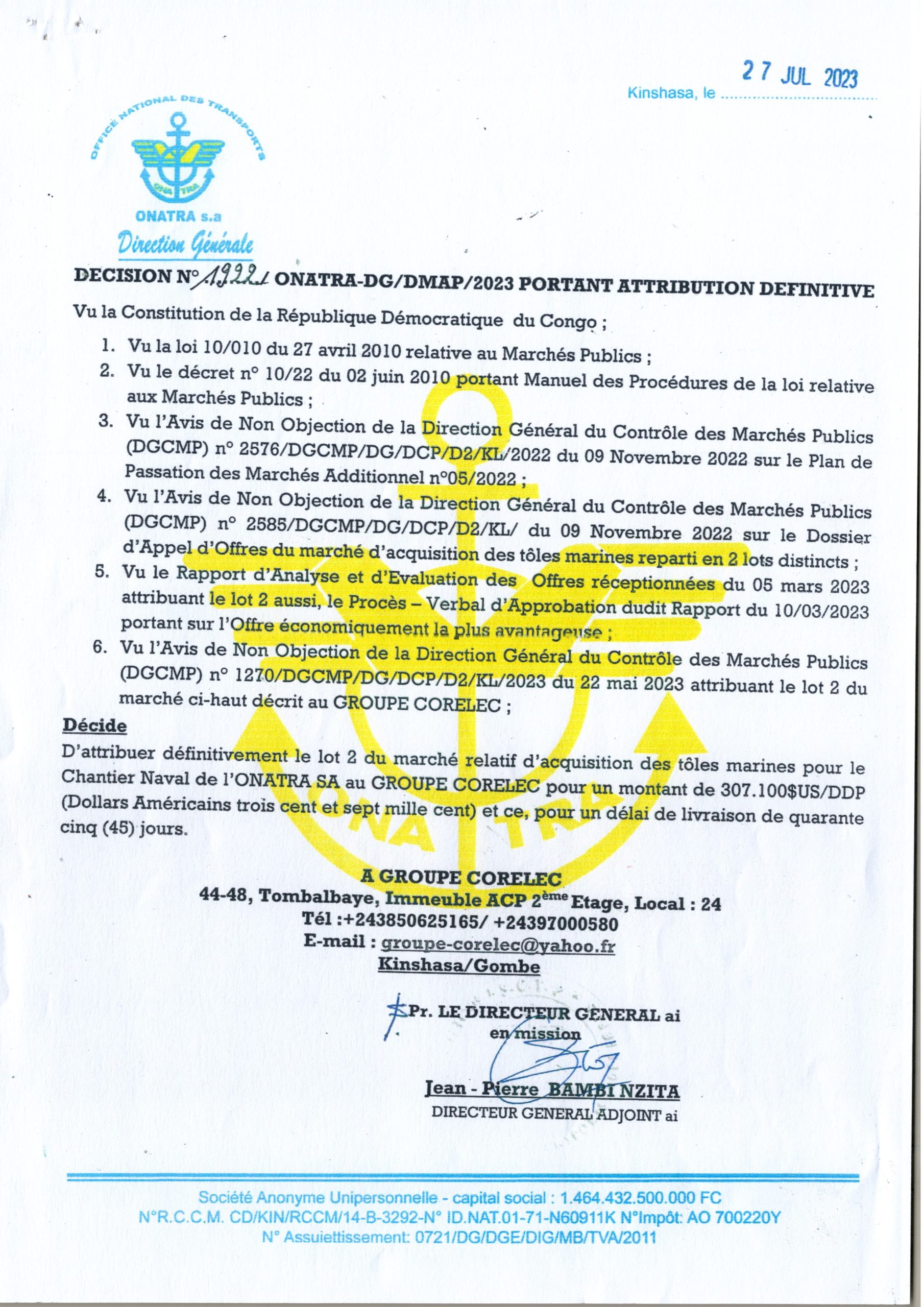 ATTRIBUTION DÉFINITIVE ACCORDÉE AU GROUPE CORELEC RELATIVE À L’ACQUISITION DES TÔLES MARINES LE CHANTIER NAVAL DE L’ ONATRA SA.