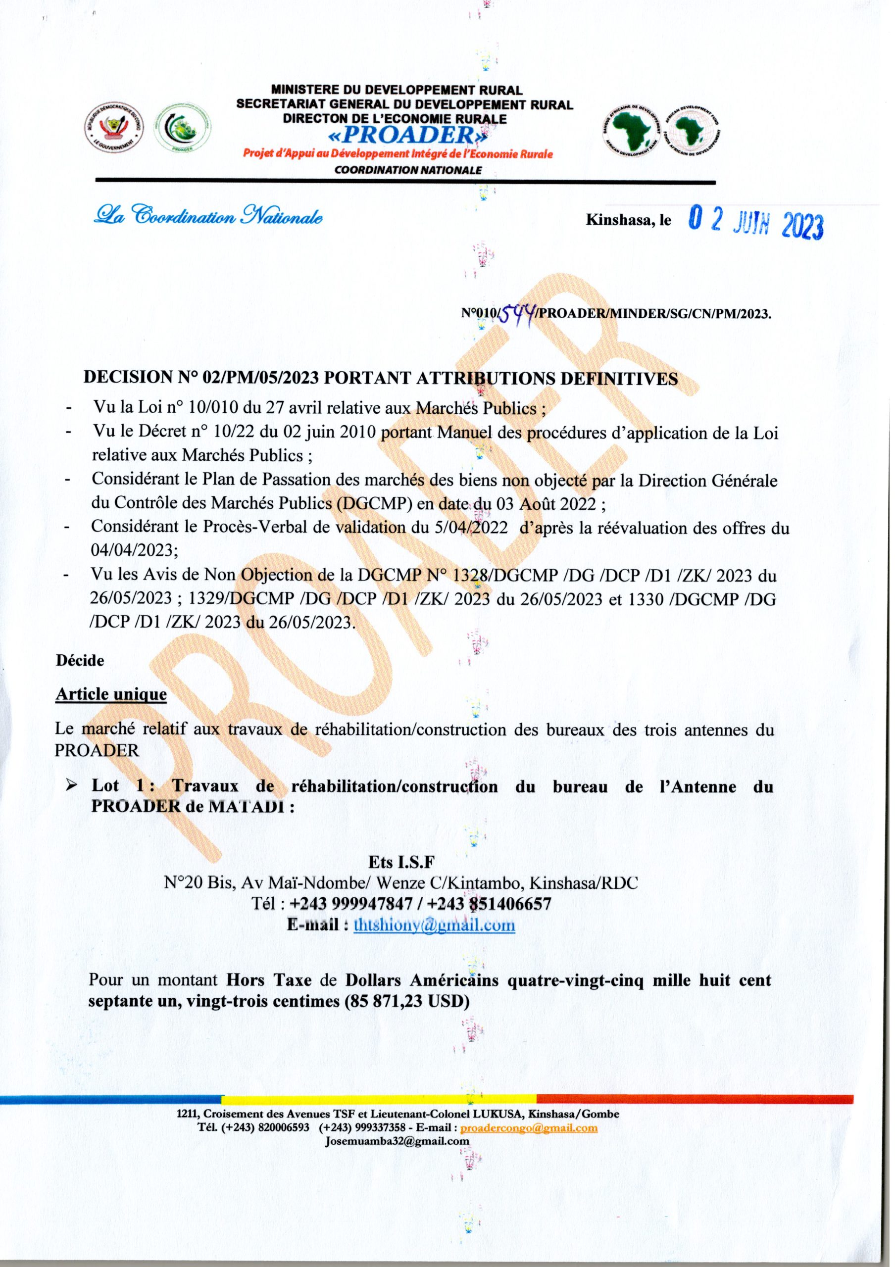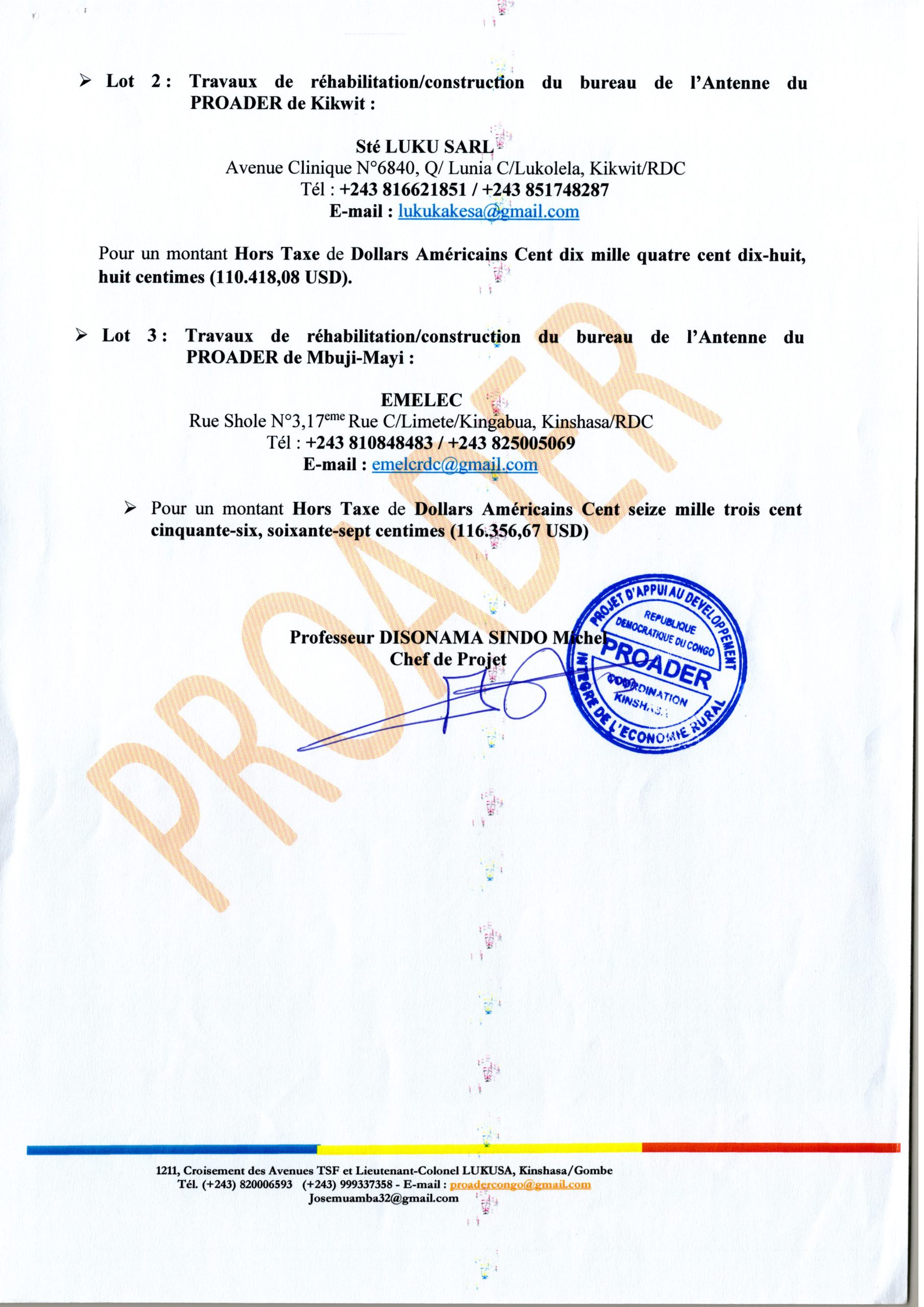 DÉCISION D’ ATTRIBUTION DÉFINITIVES ACCORDÉE AUX ETS I.S.F LOT1, À LA STÉ LUKU SARL LOT2 ET À EMELEC LOT3 RELATIVE AUX TRAVAUX RÉHABILITATION /CONSTRUCTION DU BUREAU DES ANTENNES DU PROADER DE MATADI, DE KIKWIT ET DE MBUJI- MAYI.