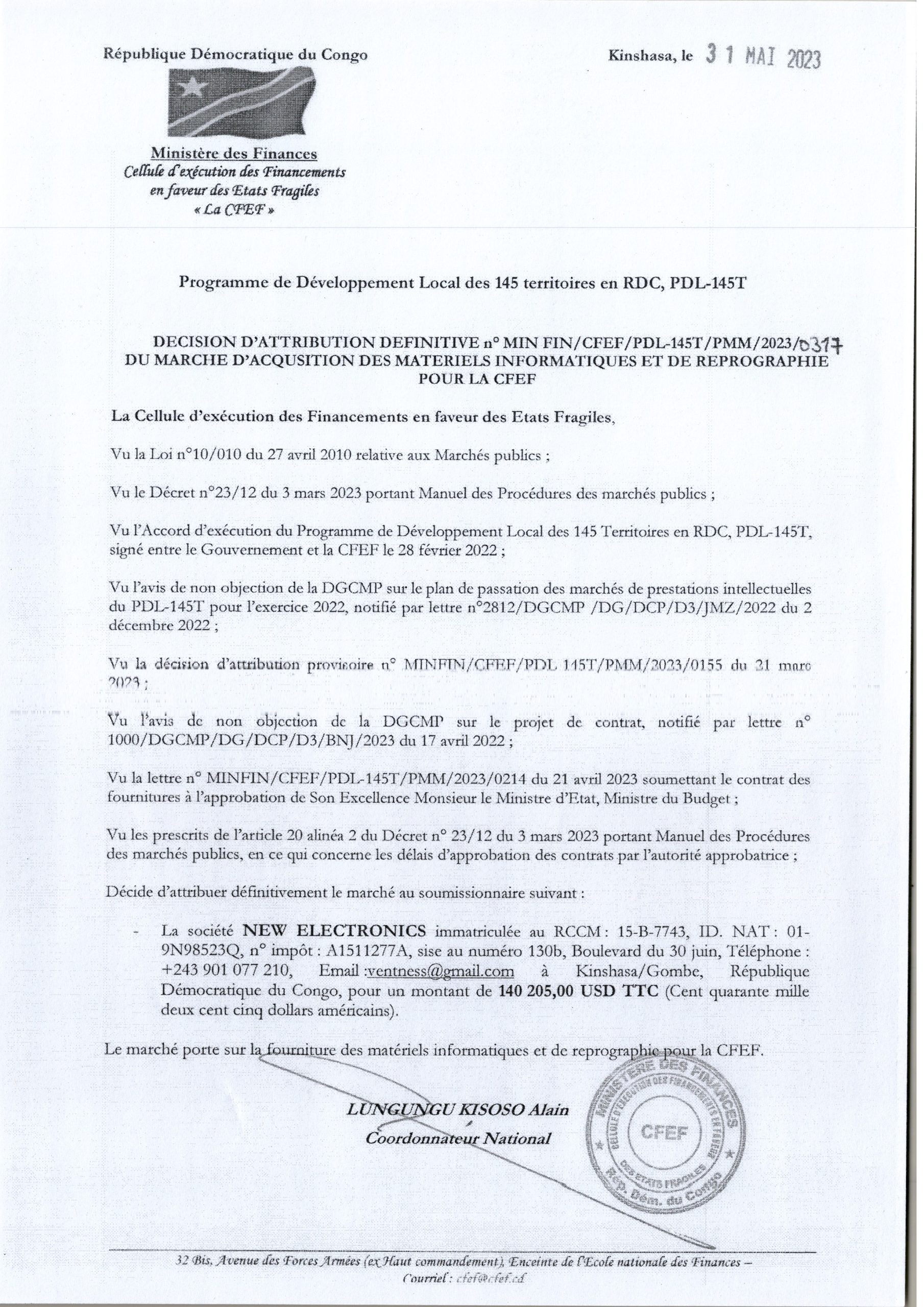 Attribution Définitive du marché d’Acquisition des matériels Informatiques et de reprographie pour la CFEF à la société NEW ELECTRONICS