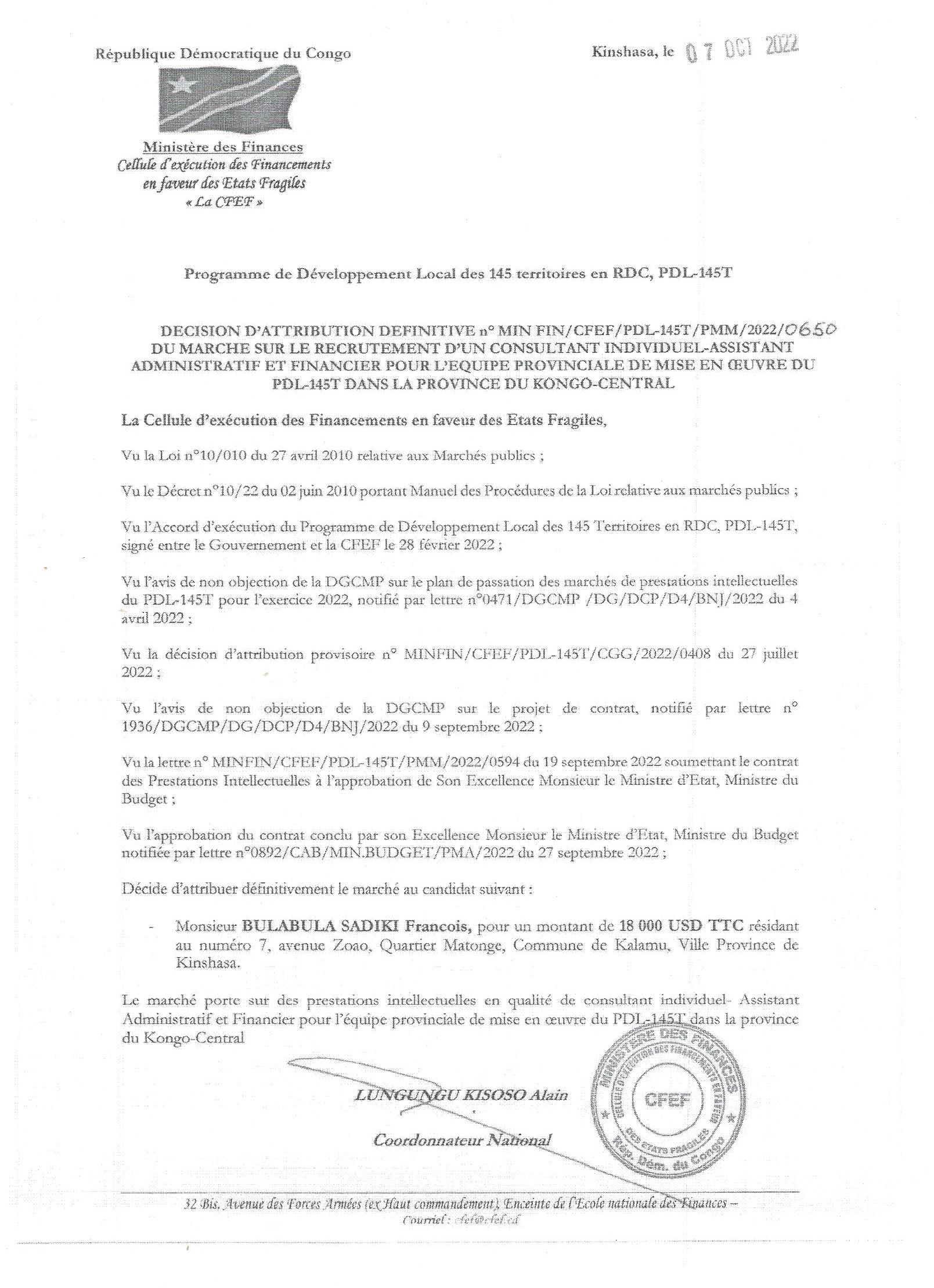 Attribution Définitive du marché sur le recrutement d’un Consultant Individuel-Assistant Administratif et Financier pour l’Equipe Provinciale de mise en œuvre du PDL-145T dans la Province du Kongo-Central à Monsieur BULABULA SADIKI François