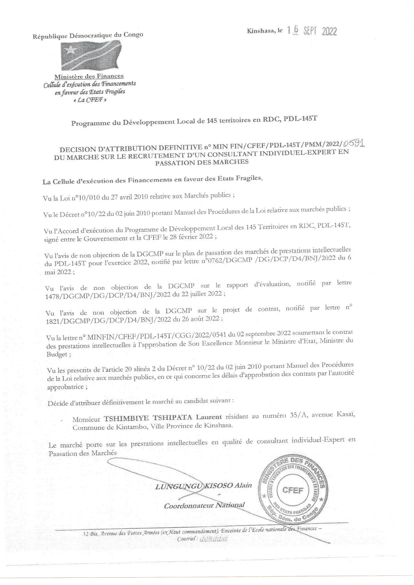 ATTRIBUTION DEFINITIVE ACCORDEE A MONSIEUR TSHIMBIYE TSHIPATA Laurent RELATIVE AU MARCHE SUR LE RECRUTEMENT D’UN CONSULTANT INDIVIDUEL-EXPERT EN PASSATION DES MARCHES.