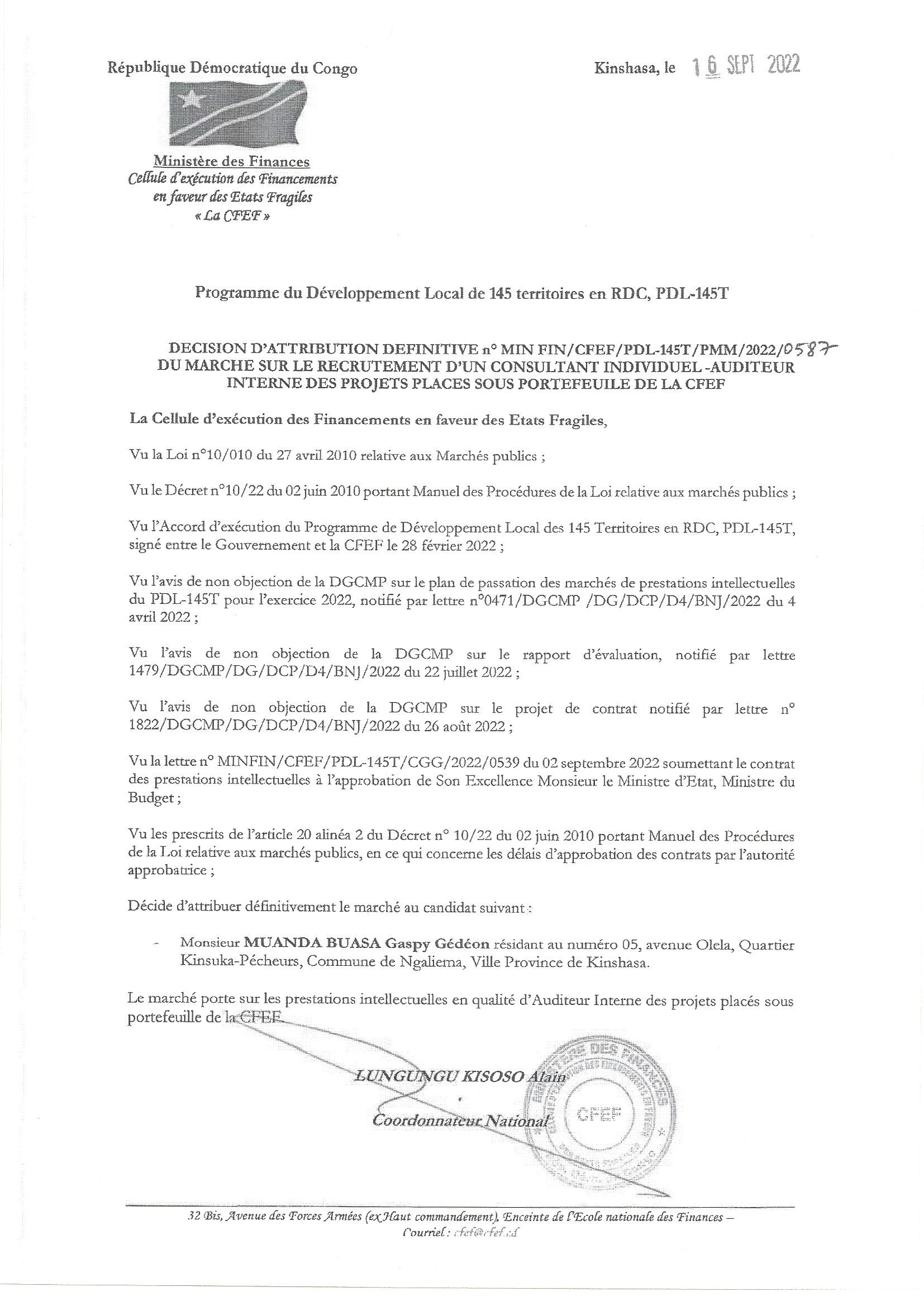 Attribution Définitive du marché sur le recrutement d’un Consultant Individuel-Assistant Administratif et Financier pour l’Equipe Provinciale de mise en œuvre du PDL-145T dans la Province du KWANGO à Monsieur KAY NSUMPI NDAYA