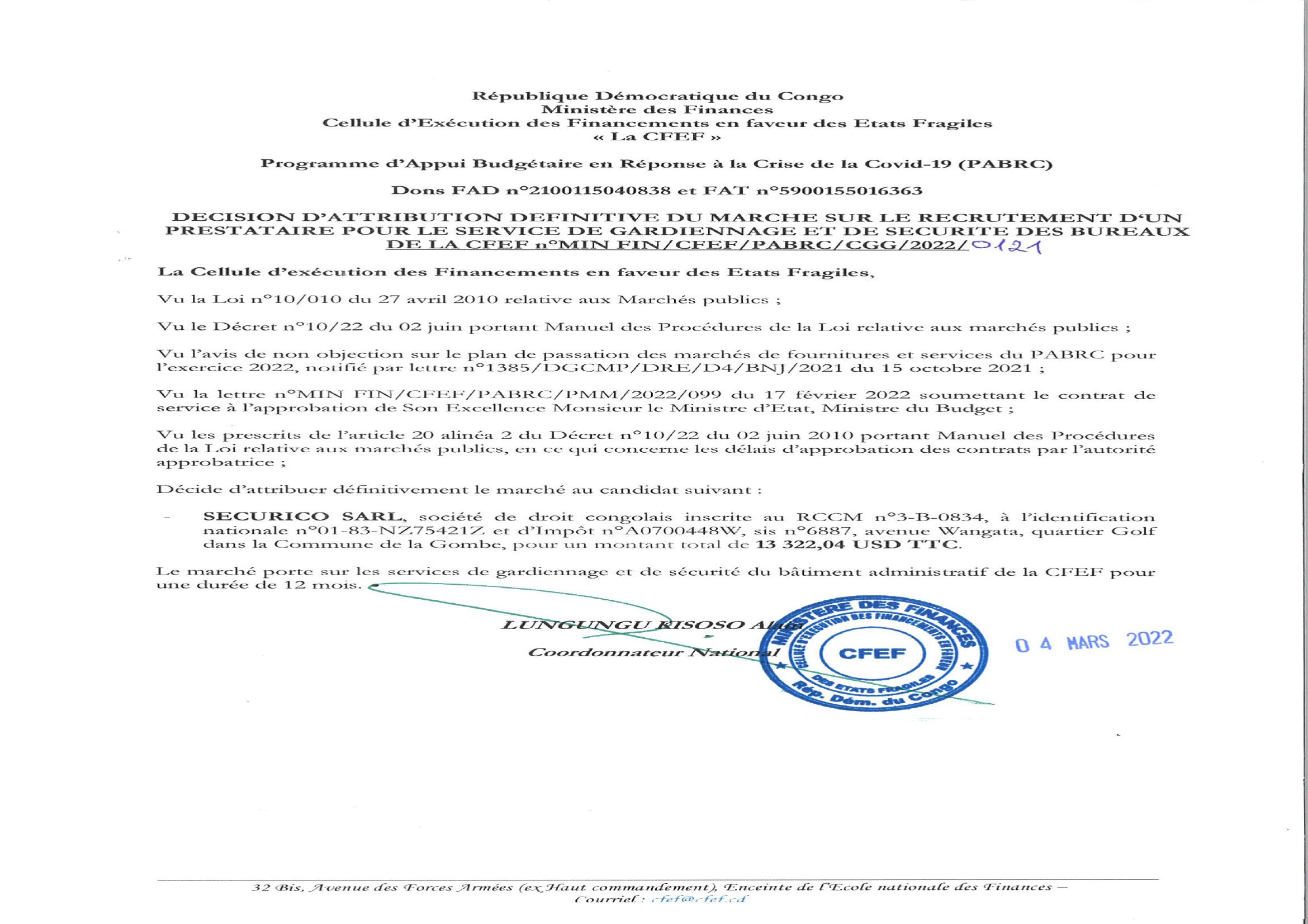 ATTRIBUTION DÉFINITIVE DU MARCHÉ SUR LE RECRUTEMENT D’UN PRESTATAIRE POUR LE SERVICE DE GARDIENNAGE ET SÉCURITÉ DES BUREAUX DE LA CFEF À SECURICO SARL