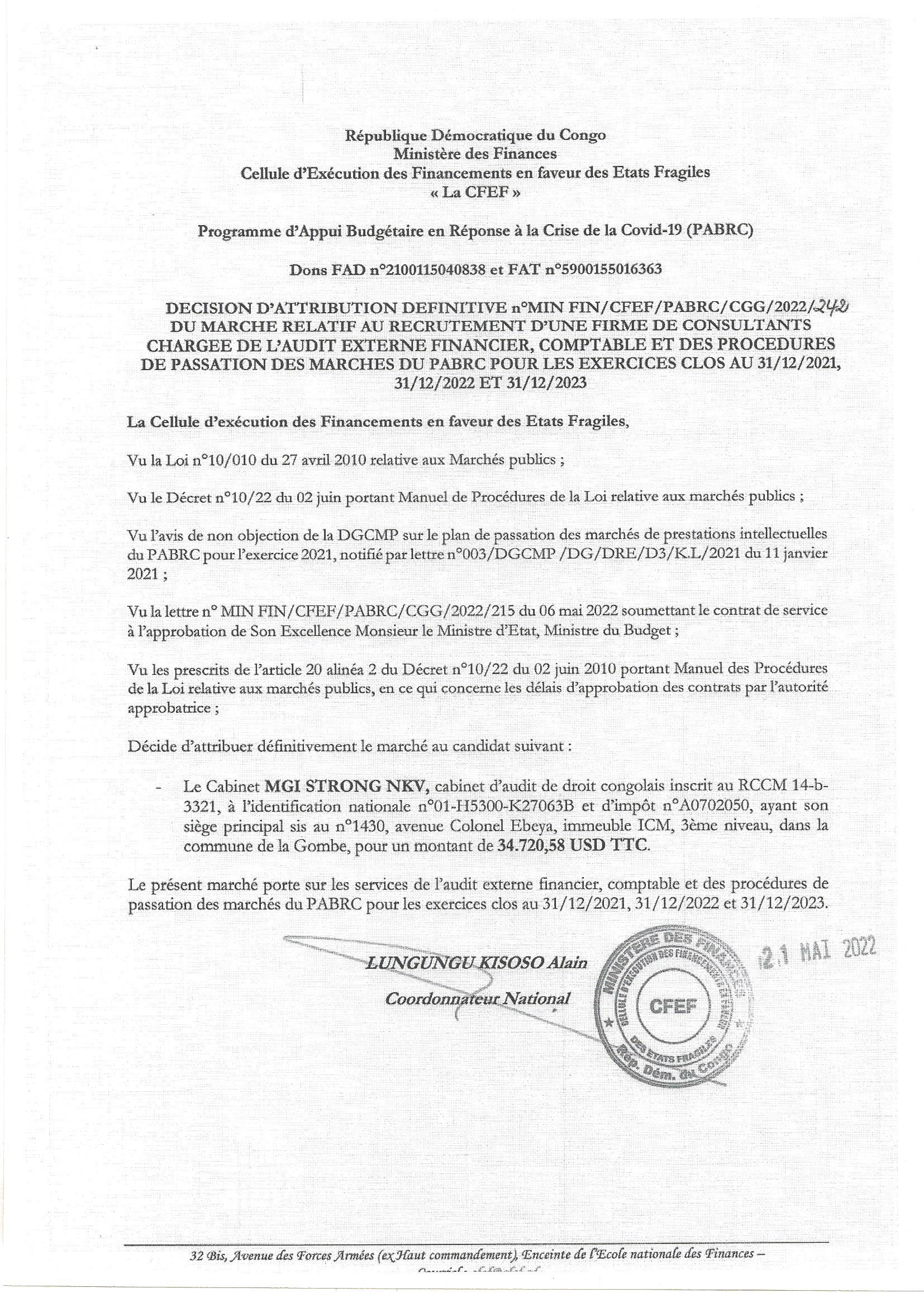 ATTRIBUTION DEFINITIVE ACCORDEE AU CABINET MGI STRONG NKV RELATIVE AU RECRUTEMENT D’UNE FIRME DE CONSULTANTS….