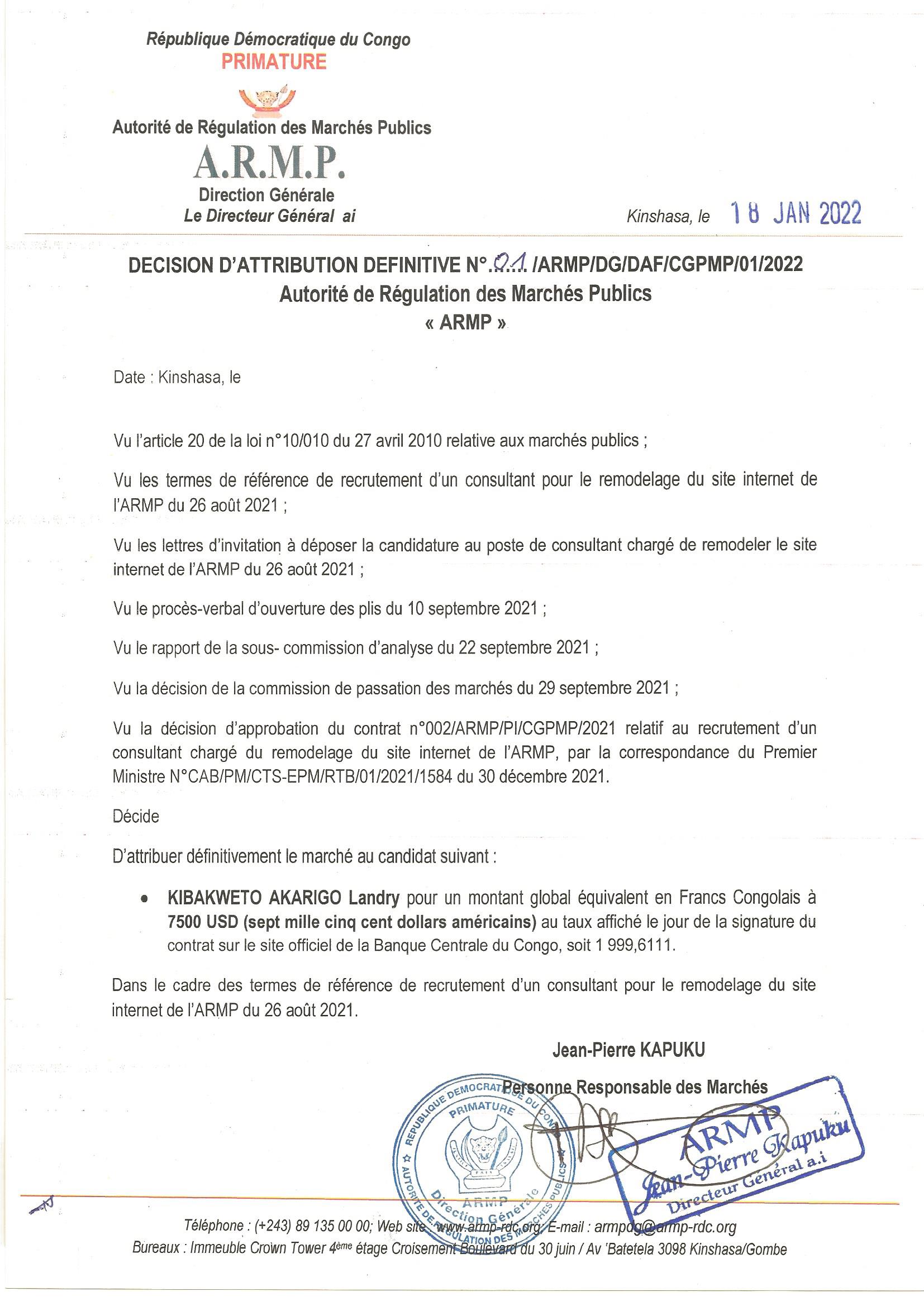 ATTRIBUTION DEFINITIVE DU MARCHE ACCORDEE A MONSIEUR KIBAKWETO AKARIGO Landry RELATVE AU RECRUTEMENT D’UN CONSULTANT CHARGE DU REMODELAGE DU SITE INTERNET DE L’ARMP.