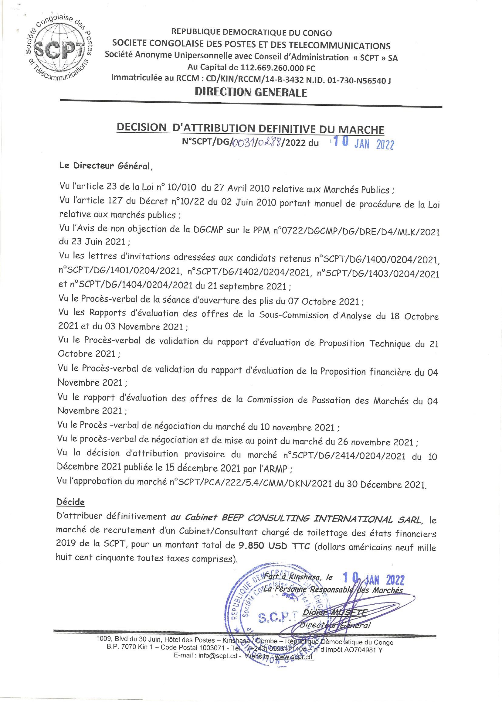 ATTRIBUTION DEFINITIVE ACCORDEE AU CABINET BEEP CONSULTING INTERNATIONAL SARL, RELTIVE AU RECRUTEMENT D’UN CABINET/CONSULTANT CHARGE DE TOILETTAGE DES ETATS FINANCIERS.