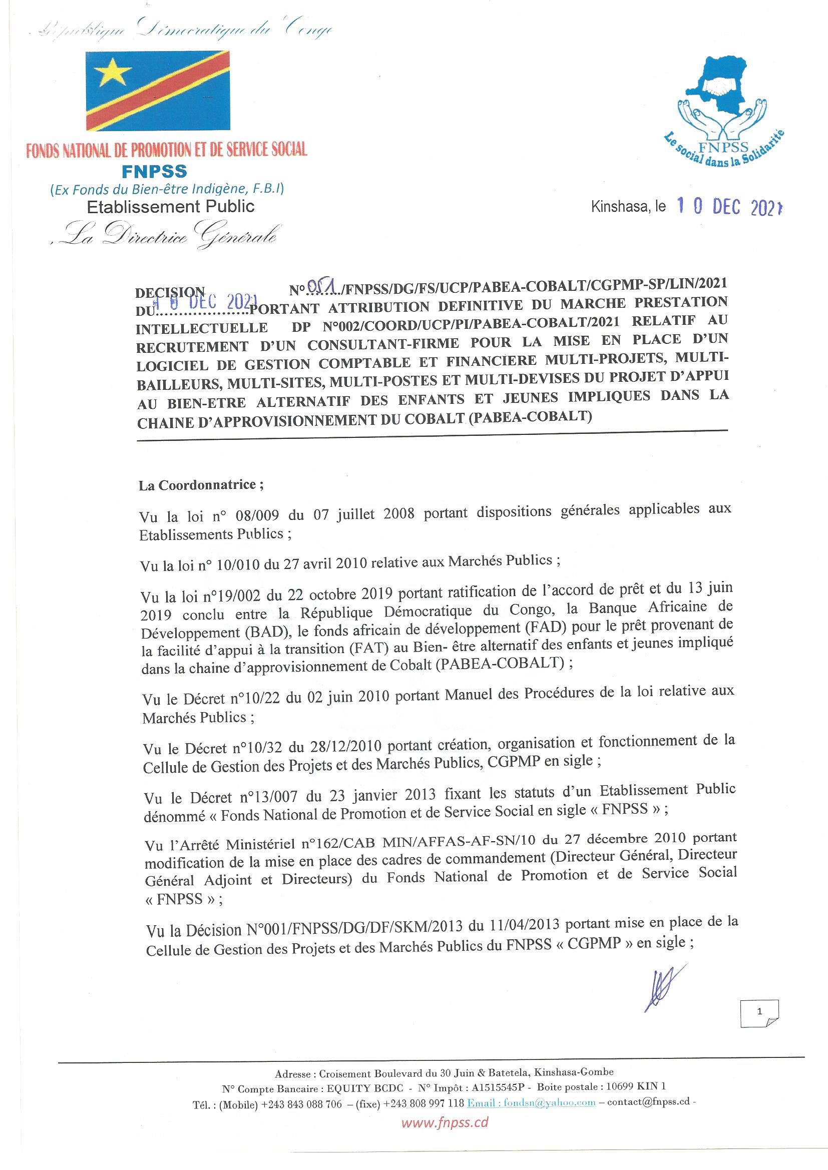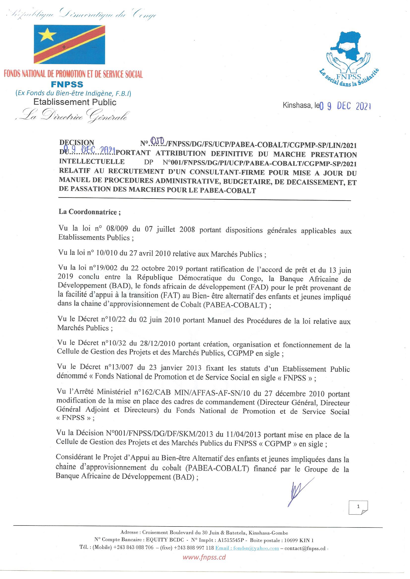 ATTRIBUTION DEFINITIVE ACCORDEE A LA SOCIETE CODEV INTERNATIONAL RELATIVE AU RECRUTEMENT D’UN CONSULTANT-FIRME POUR MISE A JOUR DU MANUEL DE PROCEDURES ADMINISTRATIVE, BUDGETAIRE, DE DECAISSEMENT, ET DE PASSATION DES MARCHES POUR LE PABEA-COBAL