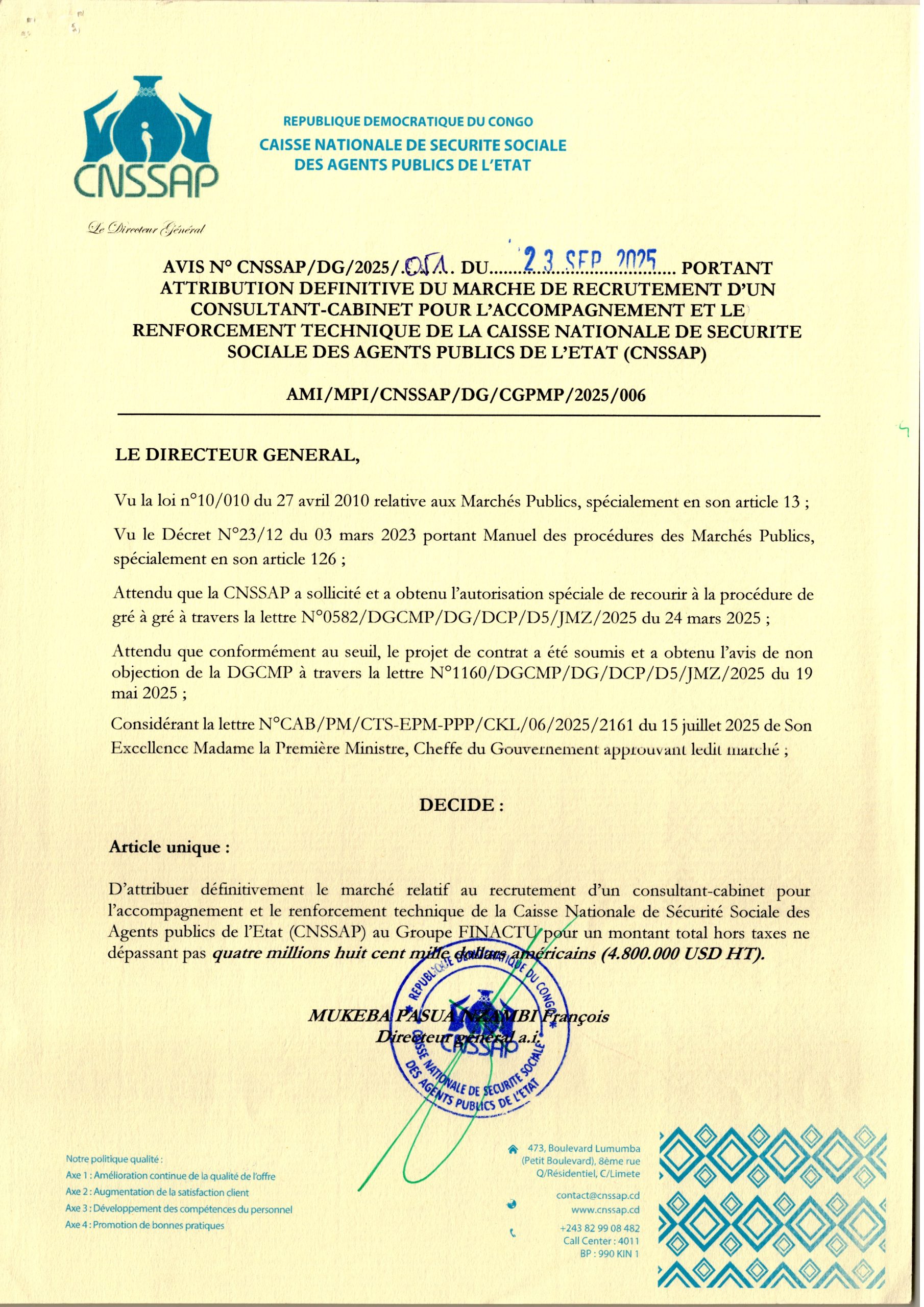 Attribution définitive accordée au Groupe FINACTU relative au recrutement d’un consultant-Cabinet pour l’accompagnement et le renforcement…