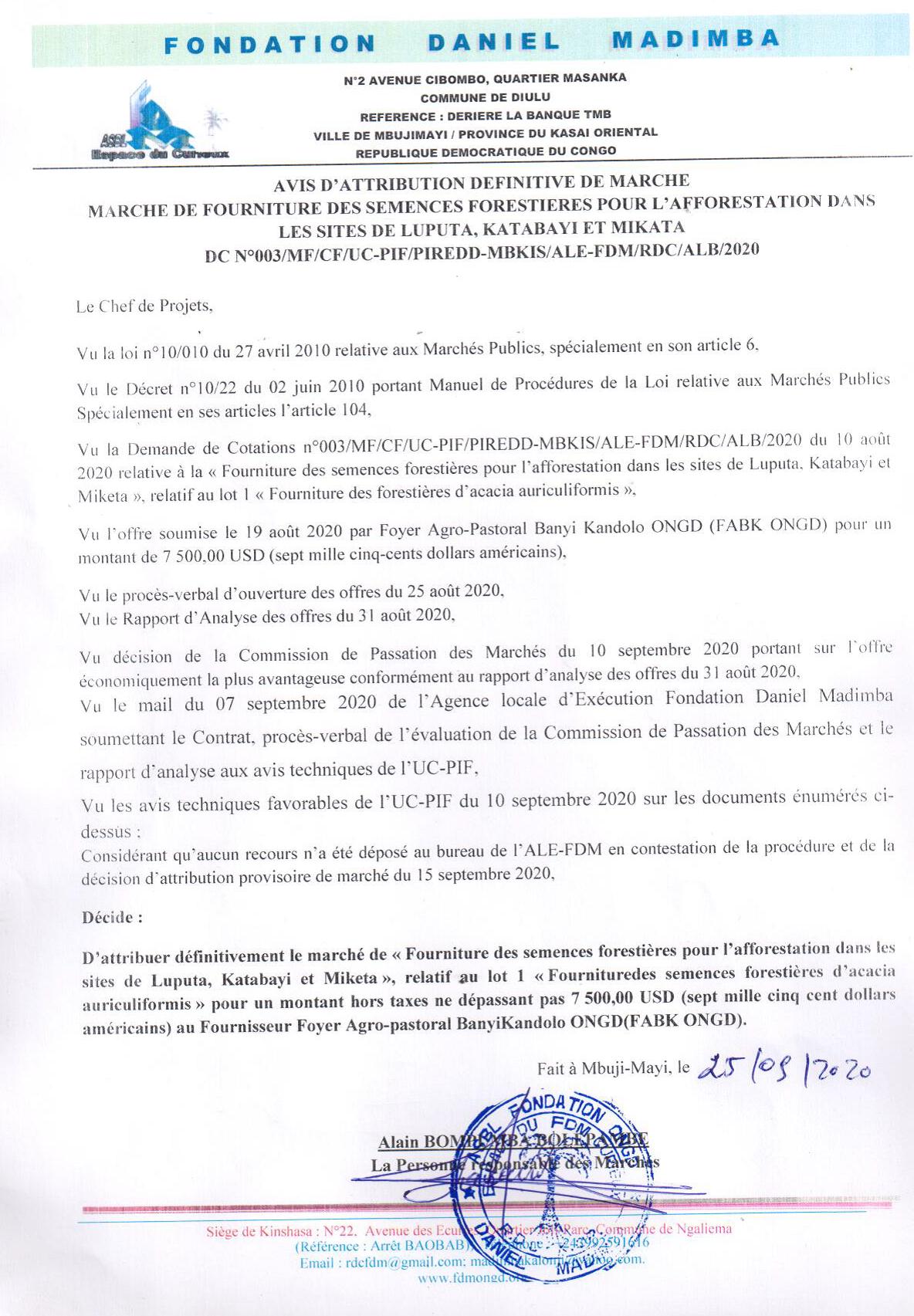 Attribution définitive accordé à la fondation Daniel madimba relatif au marché de fourniture des semences forestières pour l’afforestation dans les sites de luputa, katambayi et mikata.